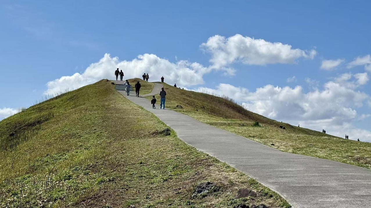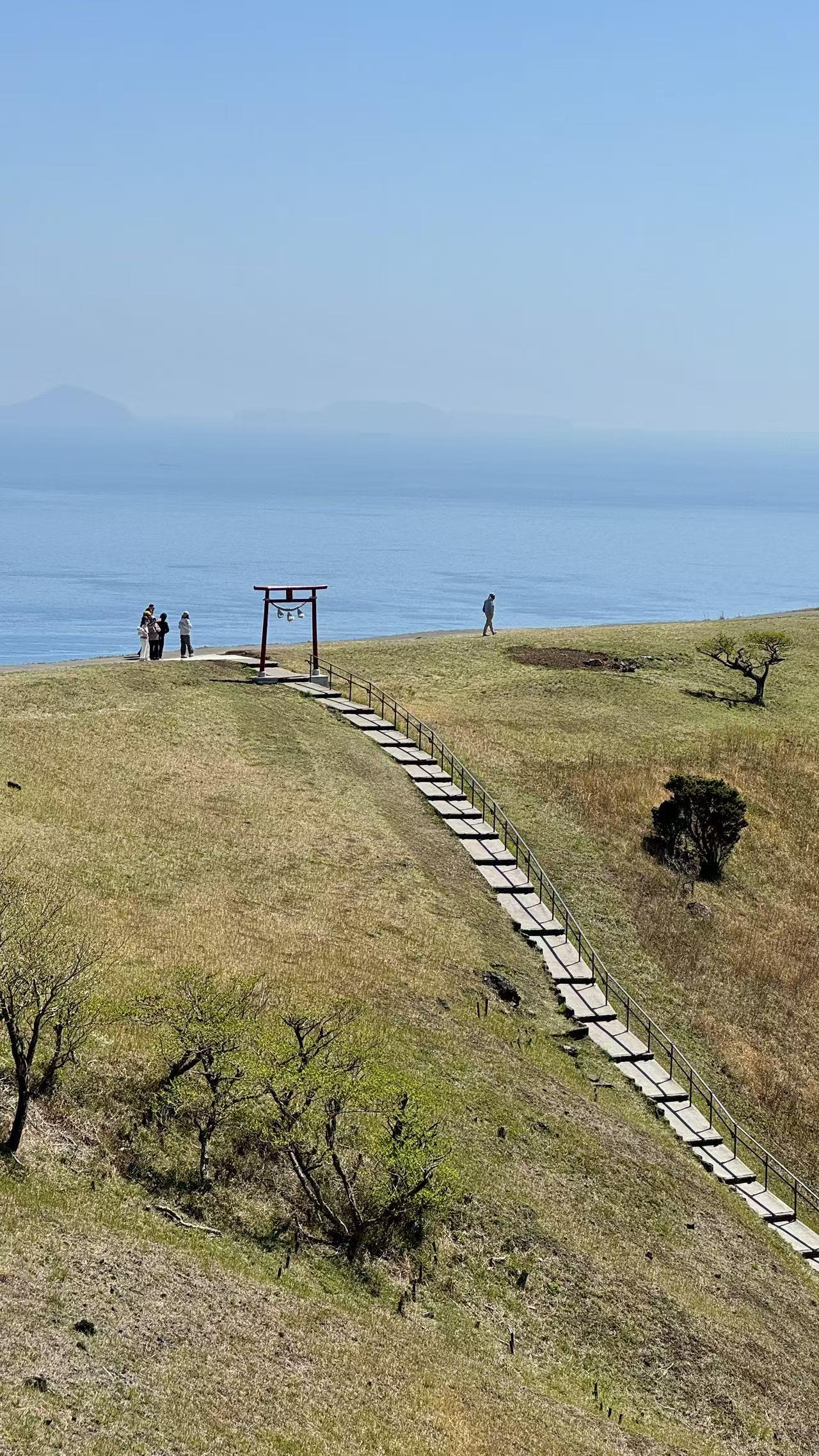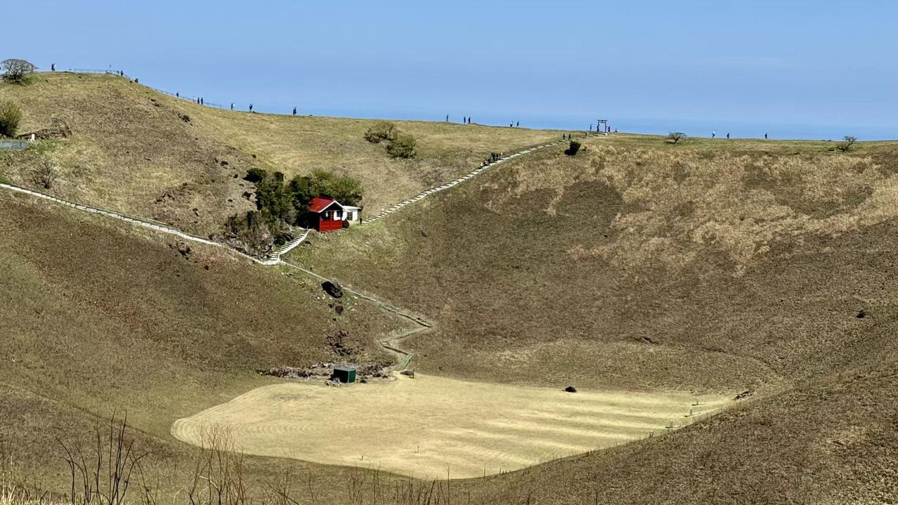第2-4张照片,是大室山的风与诗。这座伊豆东海岸的标志性火山,有着圆润的山体与开阔的草甸。沿着石阶向上,尽头那座朱红色的鸟门静静立在崖边,面朝无垠的太平洋,风从海面吹来,带着咸湿的气息,仿佛能穿透屏幕拂过脸颊。山坳里的火山口,是大地留下的温柔印记,草甸上零星的游人,在山海之间渺小又自由。站在这里,才懂伊豆的浪漫,从来不止于文学,更藏在这山海相拥的开阔里。