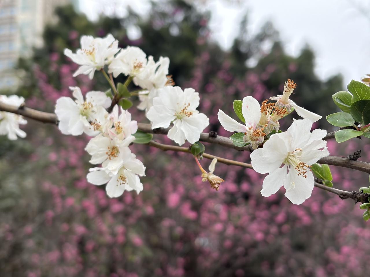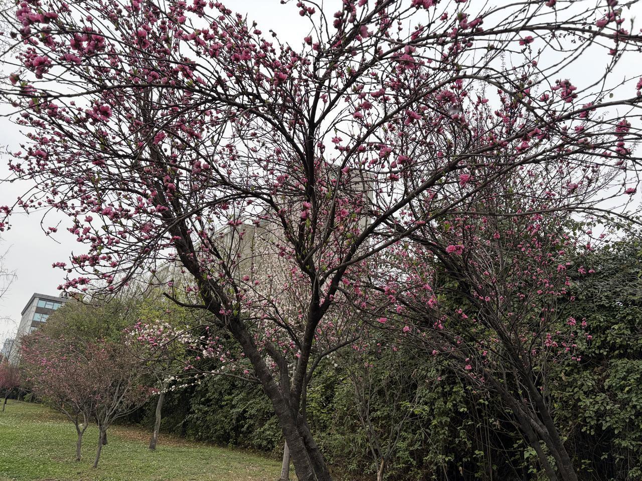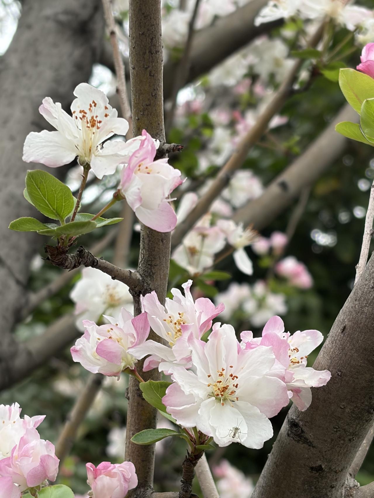 碧桃开得热烈,海棠缀着清浅,连阴雨天都挡不住它们的生机。