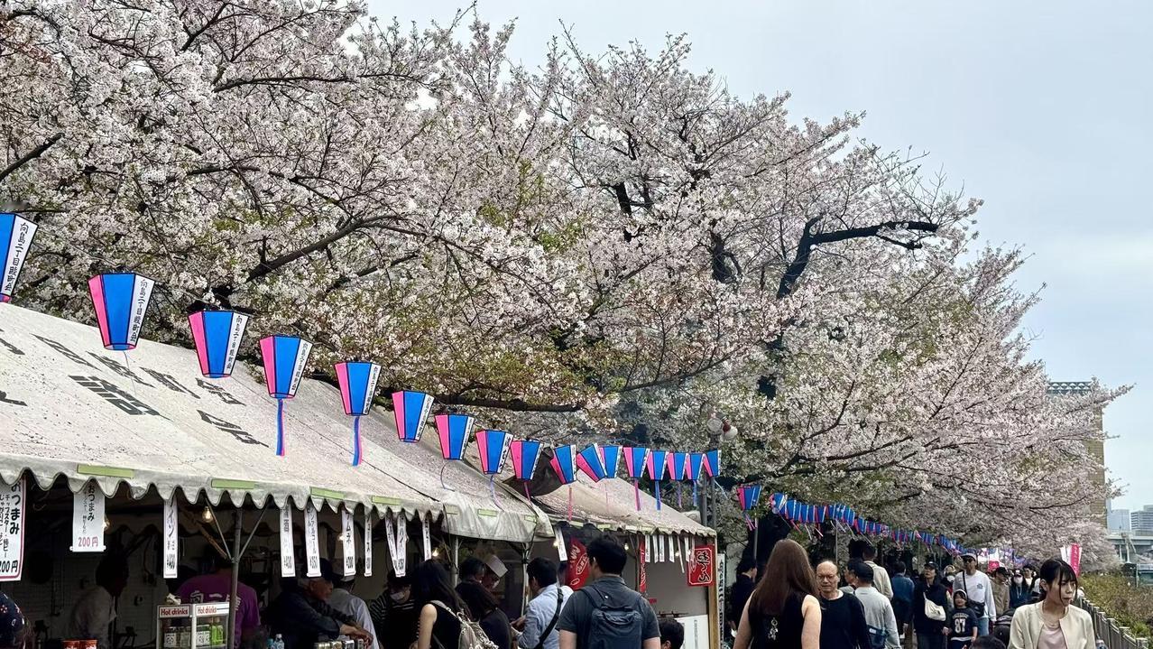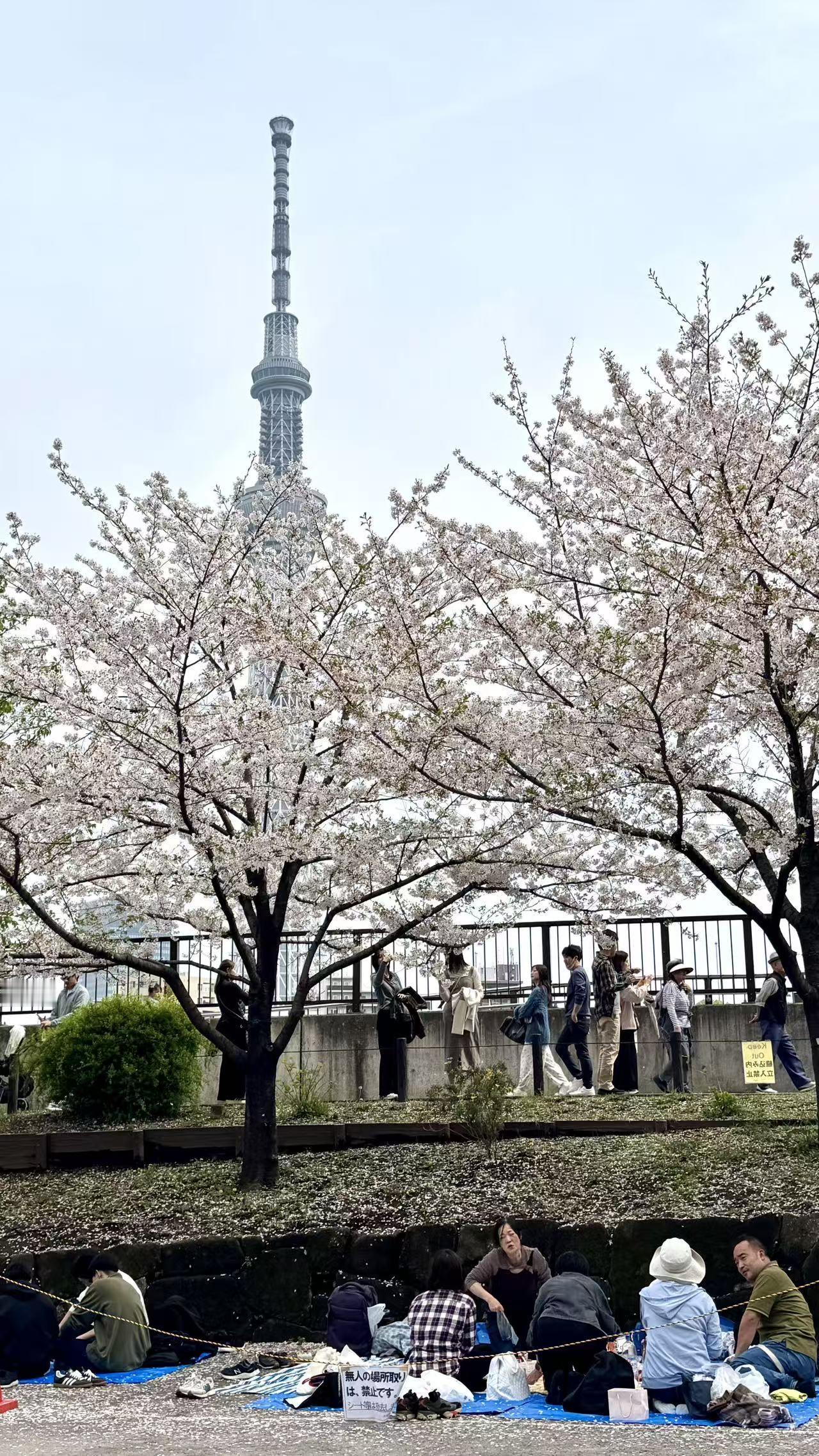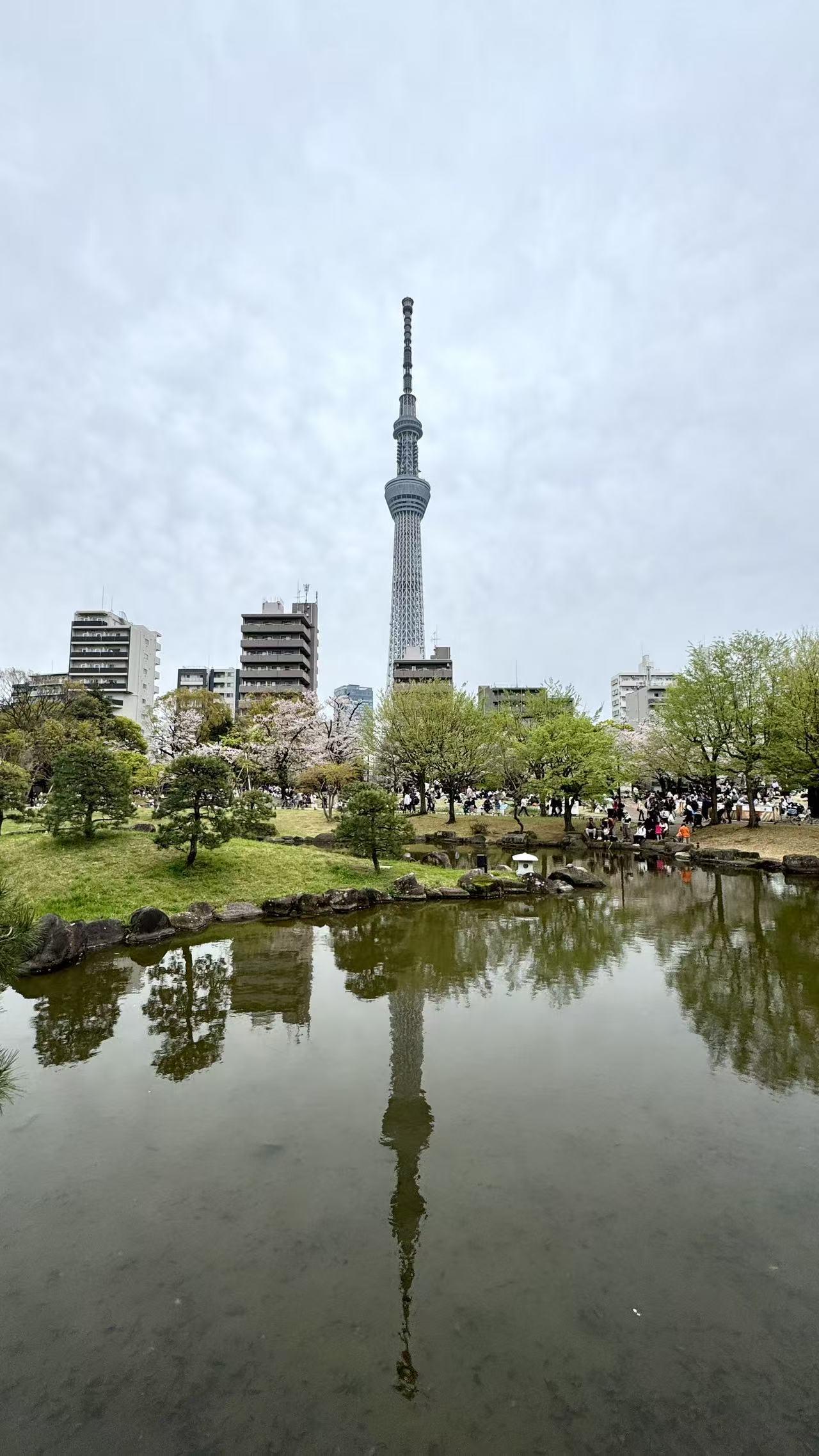 最让我欢喜的,是晴空塔与隅田公园的画面。灰白的晴空塔直刺天际,塔下的隅田公园樱花如云,粉白的花瓣缀满枝头,树下铺着蓝布的野餐垫,本地人悠闲地坐着,风里都裹着松弛的温柔。还有那张晴空塔倒映在池水中的照片,水面如镜,塔影婆娑,樱花绕着池岸,竟比画还美。女儿说这里是本地人休闲的地方,这般惬意的氛围,隔着屏幕都能感受到,我仿佛也坐在池边,看风拂过水面,晃碎满池的塔影与花影。