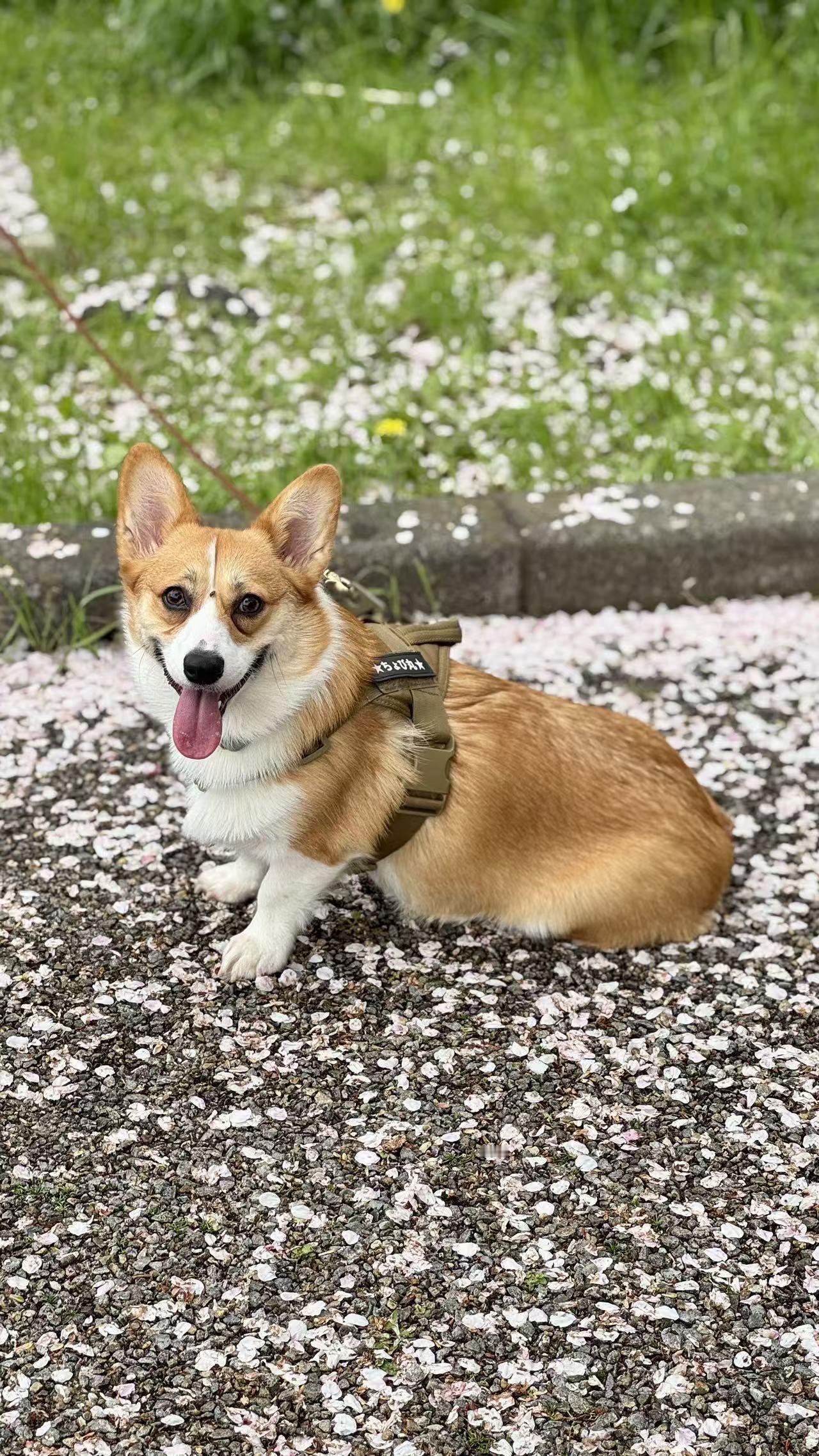 芝公园与增上寺的视角更妙,东京塔的红与增上寺的红墙相映,樱花枝桠间漏下的天光,把这座百年铁塔衬得温柔了许多。还有那张樱花树下的柯基,吐着舌头趴在落满花瓣的地面上,软乎乎的模样可爱极了,喜欢小动物的女儿定是被这小家伙逗乐了,才特意拍下。