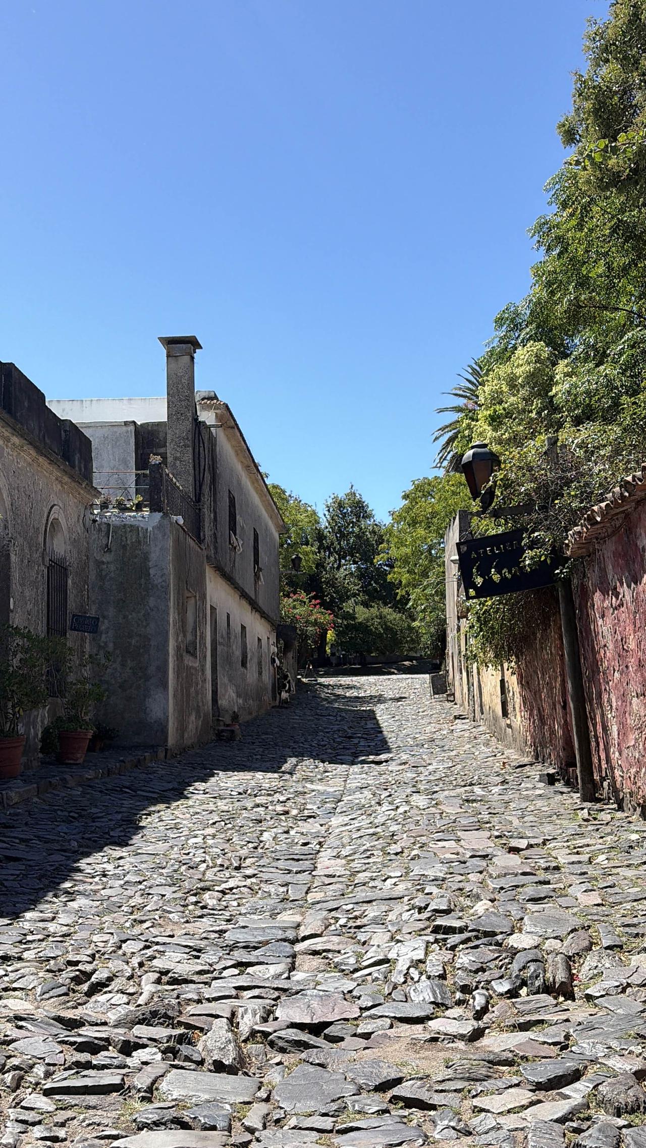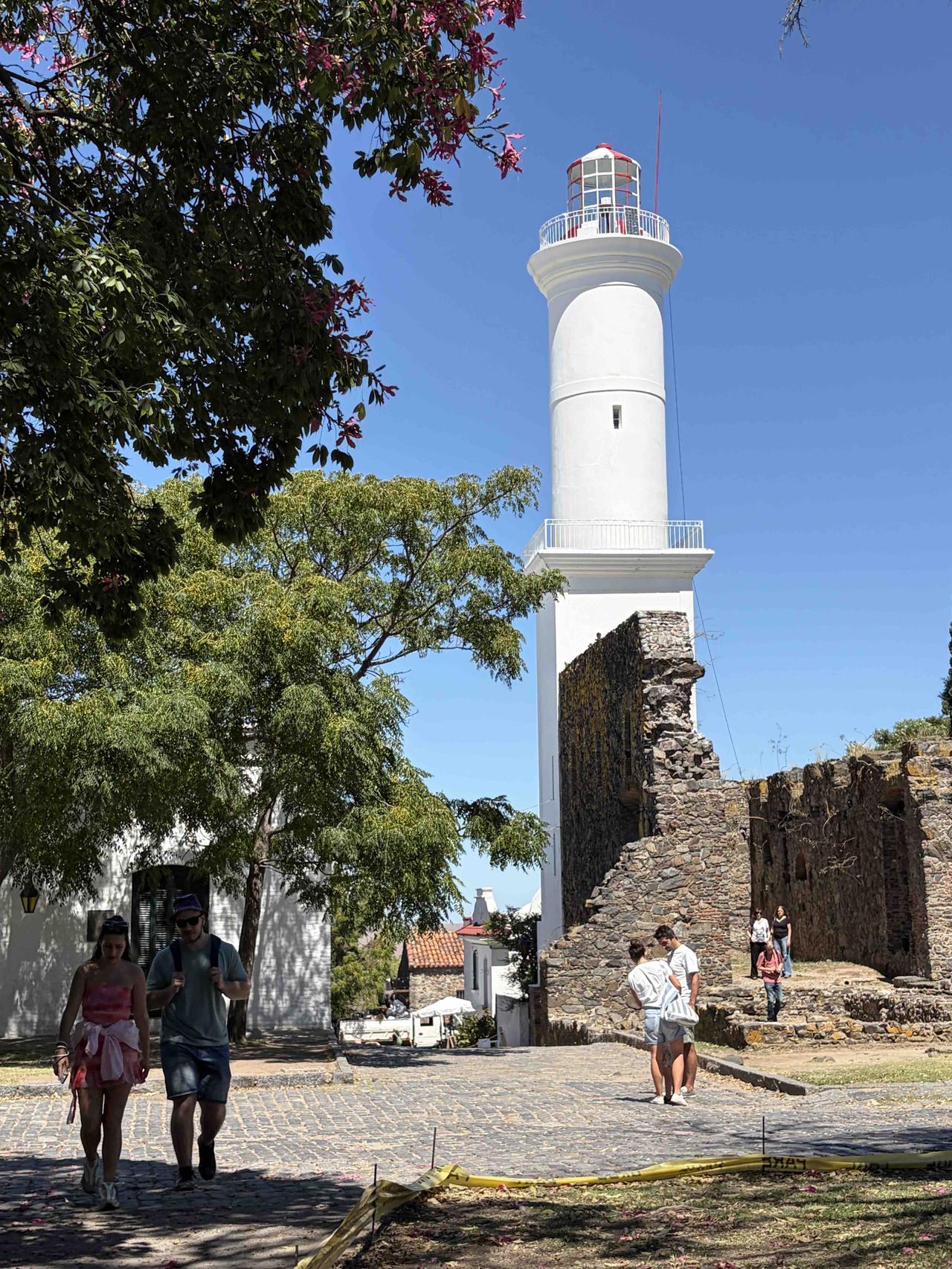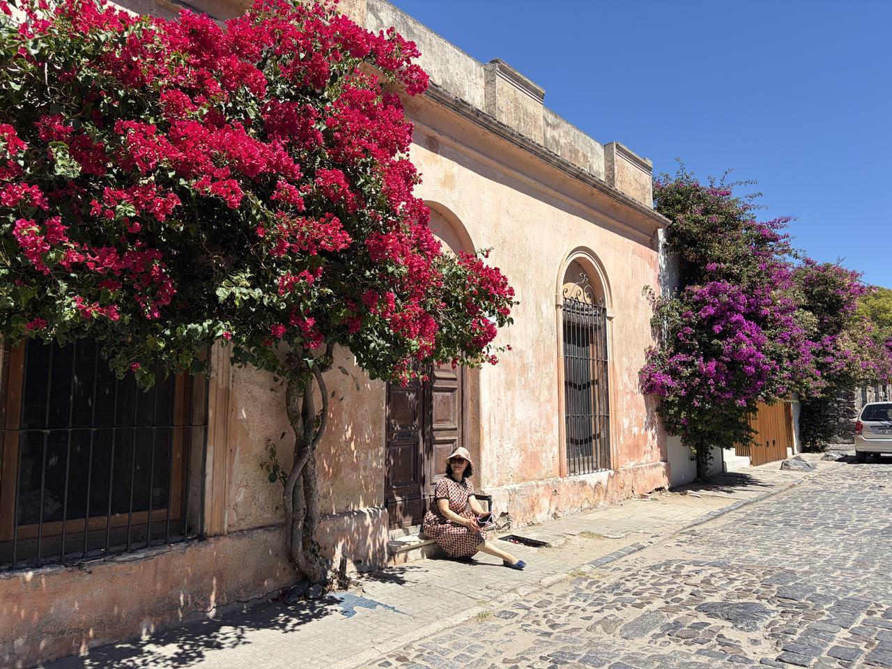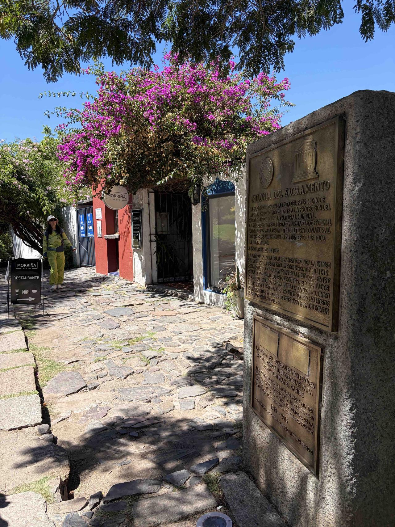 踩着三百年的鹅卵石路,穿过葡萄牙城门,路过乌拉圭最古老的教堂,在灯塔下看拉普拉塔河的风。三角梅开得正好,蓝白条纹的国旗在街角飘扬,连时间都在这里慢了半拍。