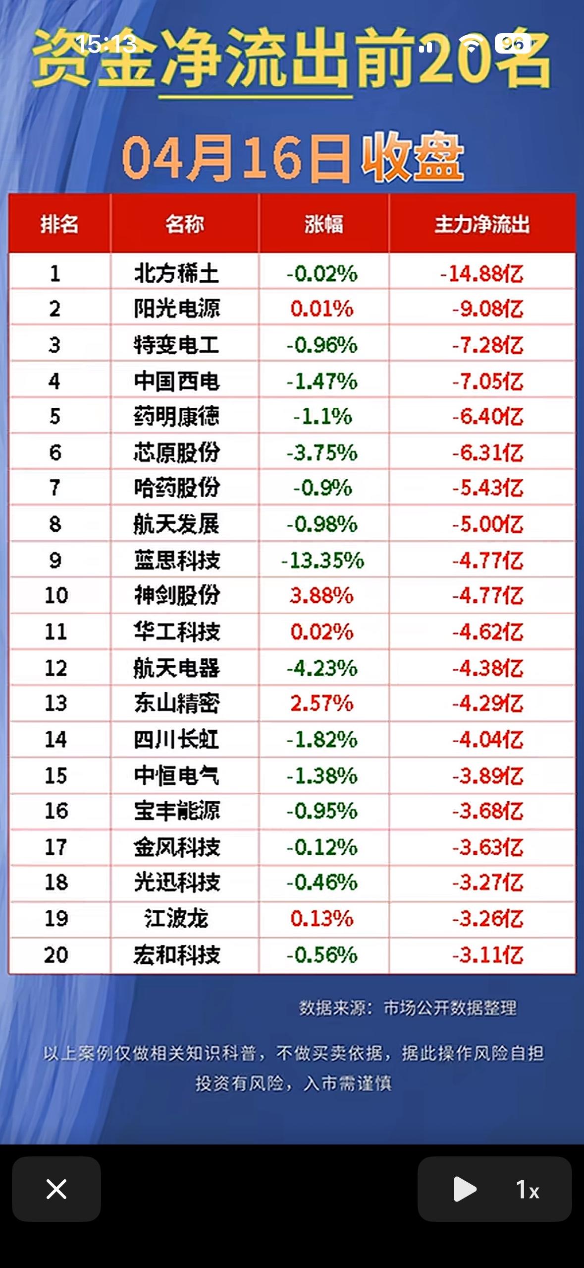“4月16日周四收盘资金净流出与净流入前20名,揭秘市场动向!”💰📈📉