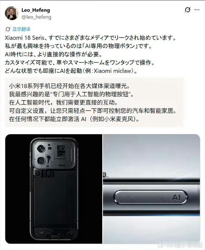 小米18Pro新增AI按键最近关于小米新机的爆料真不少啊,如果小米 18 Pro