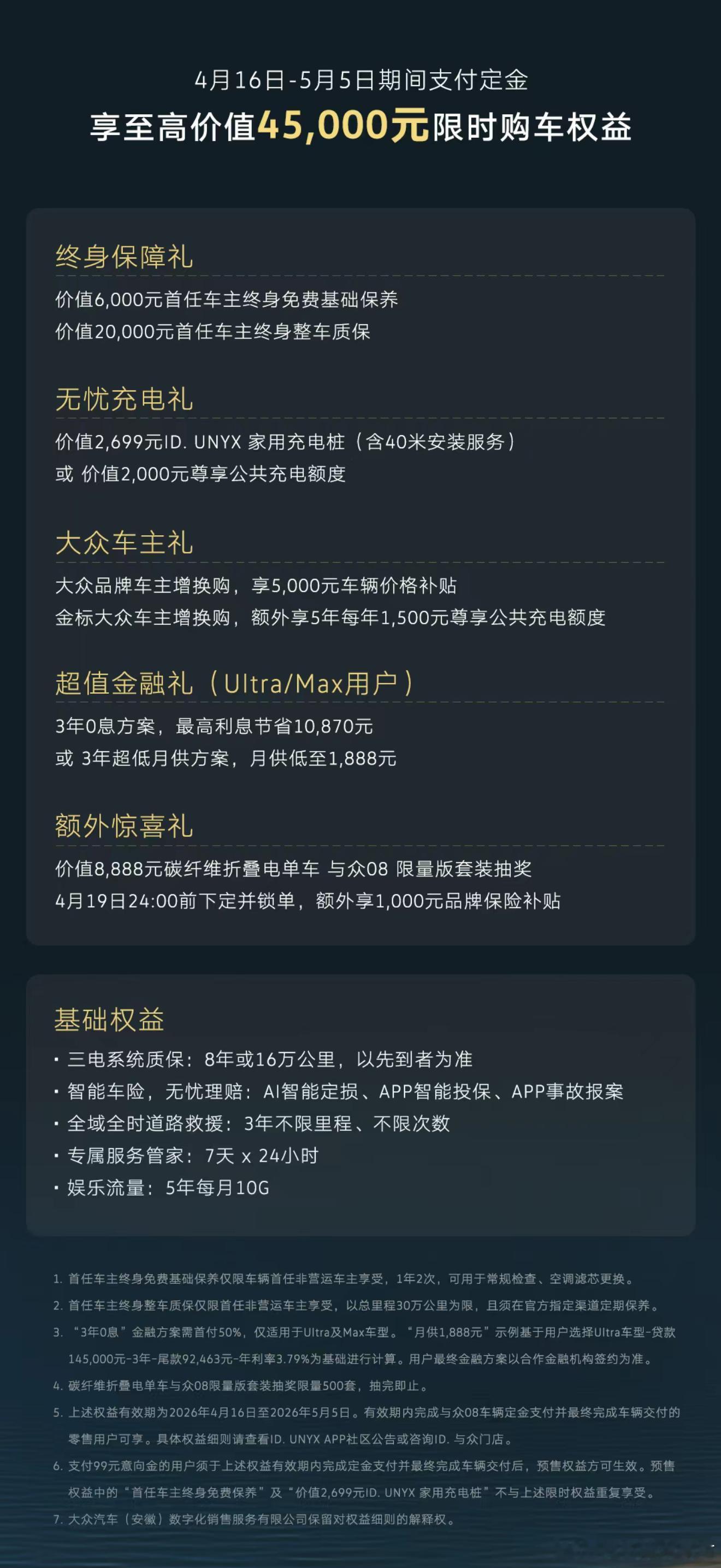 另外还有很多权益,比如充电权益、3年免息、终身整车质保、终身免费基础保养等等。大v聊车与众08