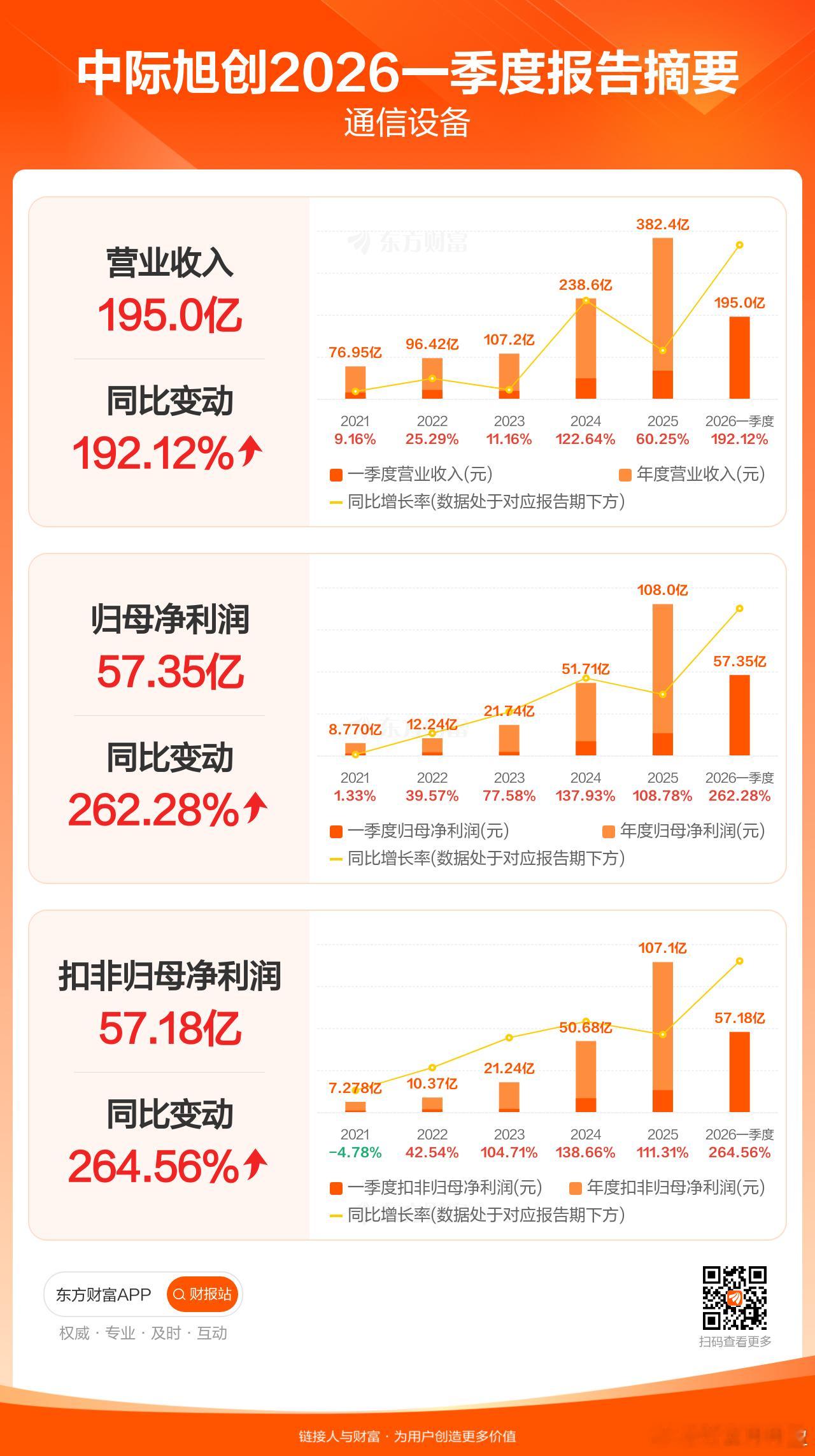 中际旭创公告,2026年第一季度营收为194.96亿元,同比增长192.12%;净利润为57.35亿元,同比增长262.28%。业绩变动主要系受益于终端客户对算力基础设施的强劲投入,公司产品出货持续增长。