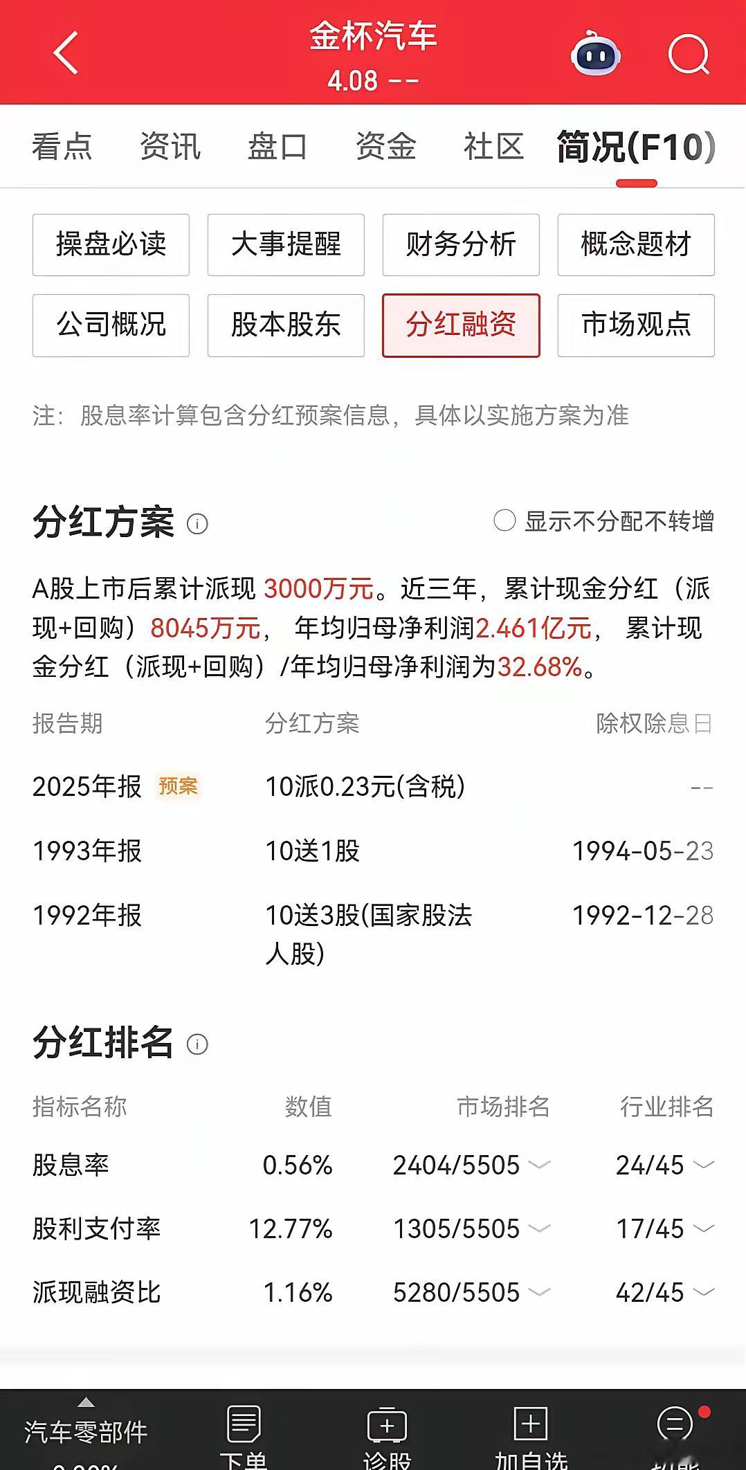 真是开了眼了,A股居然还真有一毛不拔的公司。金杯汽车于1992年上市,是A股最早上市的一批公司,距今已经34年了,公司所属行业汽车零部件,主营业务为设计、生产和销售汽车零部件,公司是国内最大的轻型客车制造企业之一。