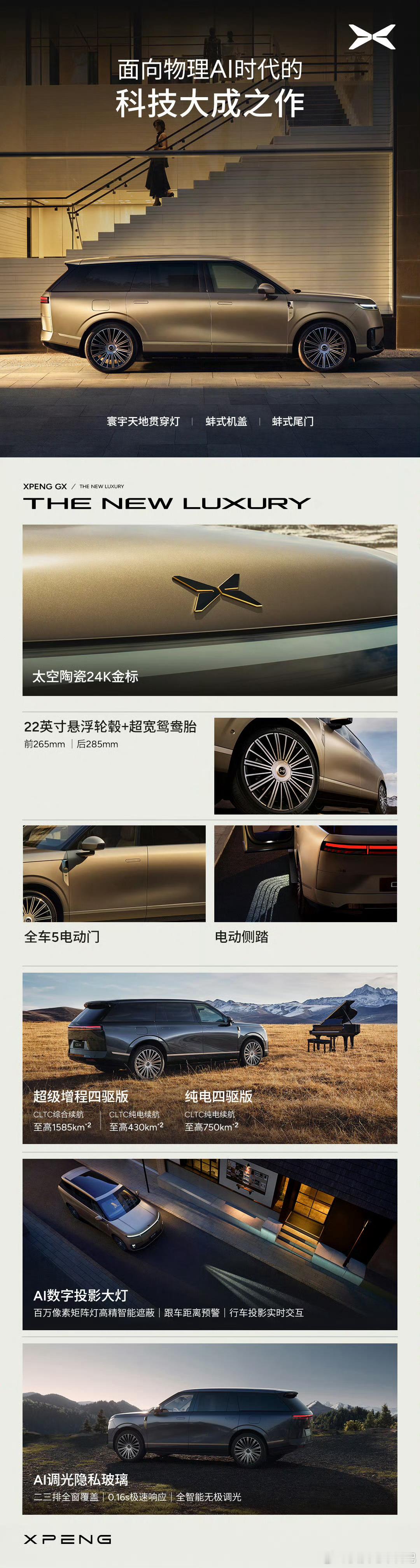 打个总结,小鹏GX,在我看来,就是 G9+X9+物理AI的集大成之作,也依旧是实用主义主导,综合产品力拉满,目前公布的39.98万,只是预售价,且按照惯例,这大概率会是一个水分挺大的烟雾弹,结合G9的定价,我觉得GX 的最终售价大概率会卡30~35万这个区间,跟X9高度重叠,共同组成小鹏的高端旗舰双子星。