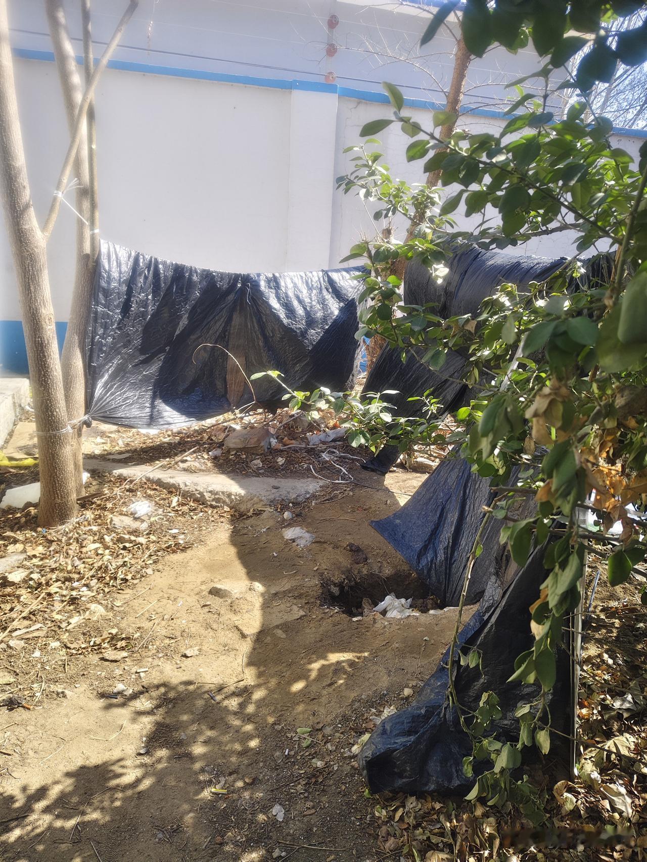 光明路凤凰世嘉东自来水厂西墙外有一片小树林,因附近没有公共厕所,所以小树林便成了内急市民的最佳选择,但因为缺乏统一管理,会经常出现随地拉尿现象,更尴尬的是有时候男女撞车。今年春节前,不知哪位好心人,不畏严寒,自带工具,发扬雷锋精神,捡了点破塑料布在树林深处弄了这么一个“茅坑”,这既解决了人民群众上茅坑难的问题,又解决了随地大小便的不雅行为,更避免了男女不期而遇的尴尬,同志们都是~挖茅坑的人真好!