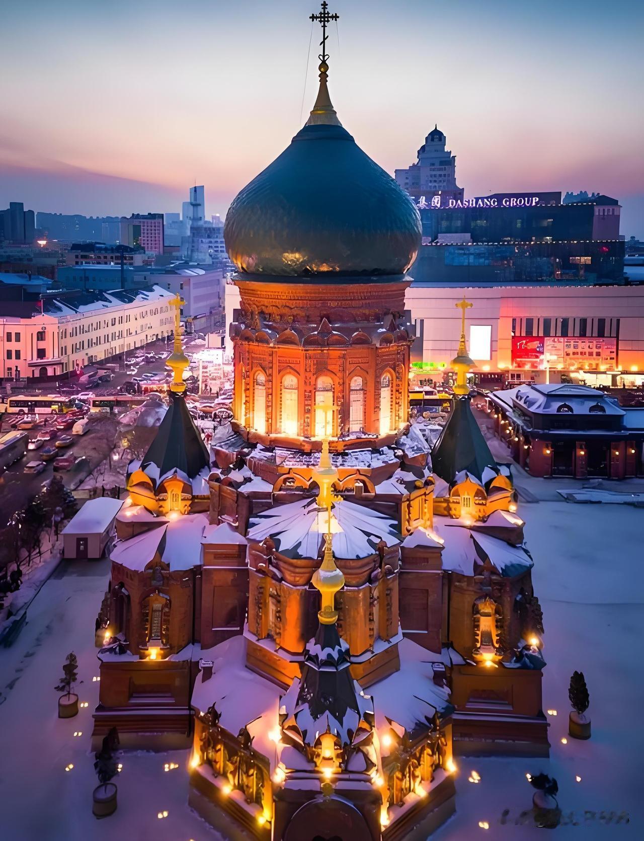 索菲亚教堂,中央大街,老道外·中华巴洛克:中国最大、保存最完整的中华巴洛克街区。南岗花园洋房,哈尔滨火车站,哈尔滨铁路博物馆等
