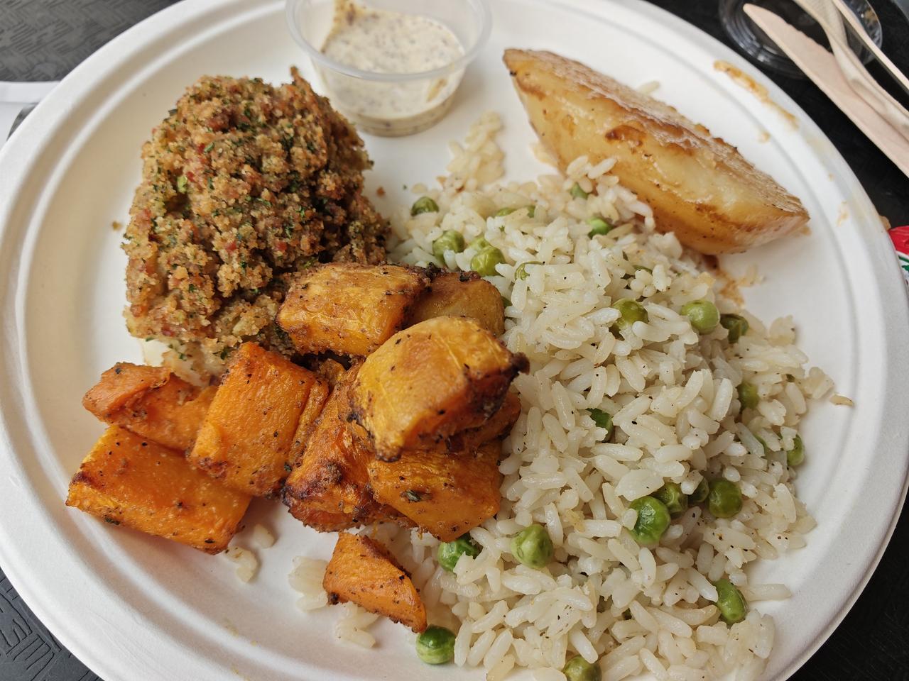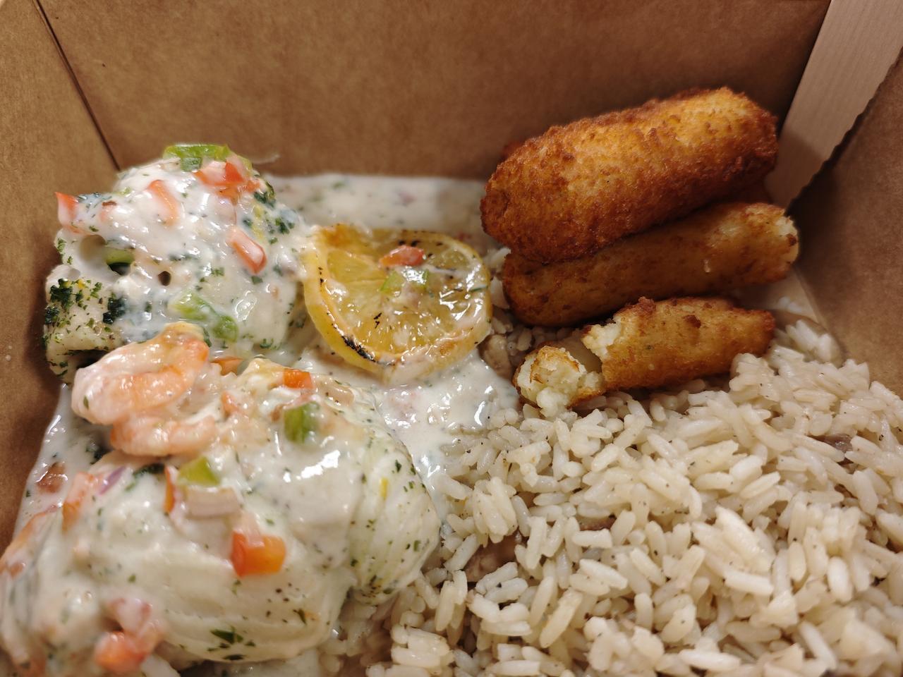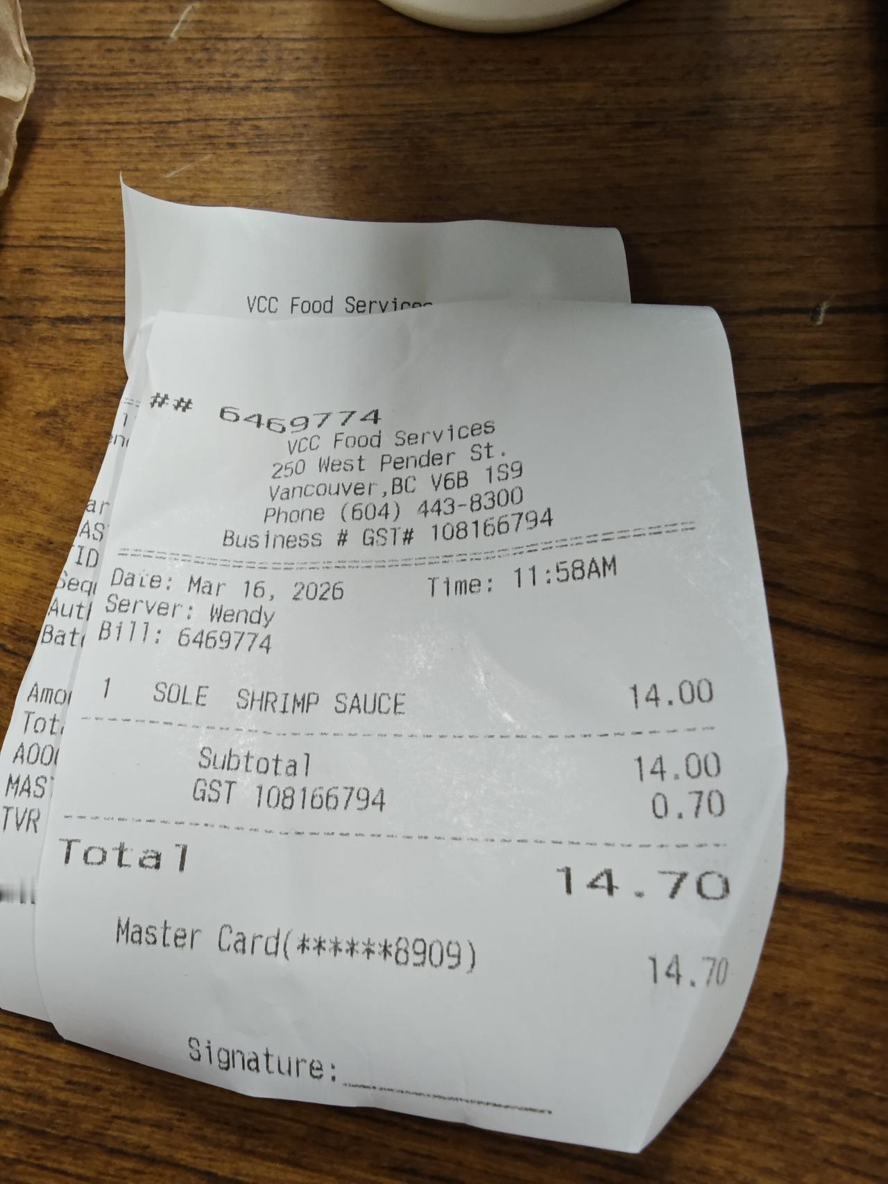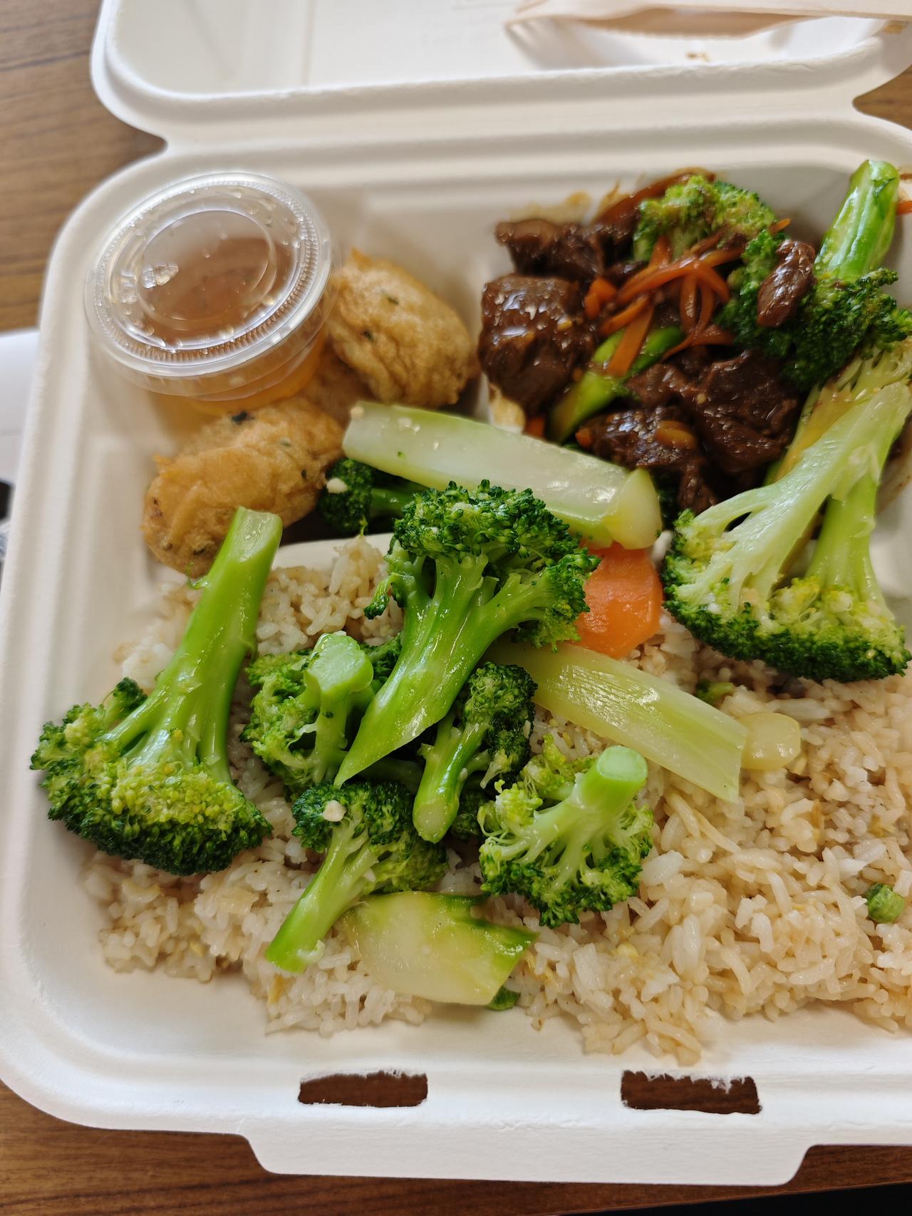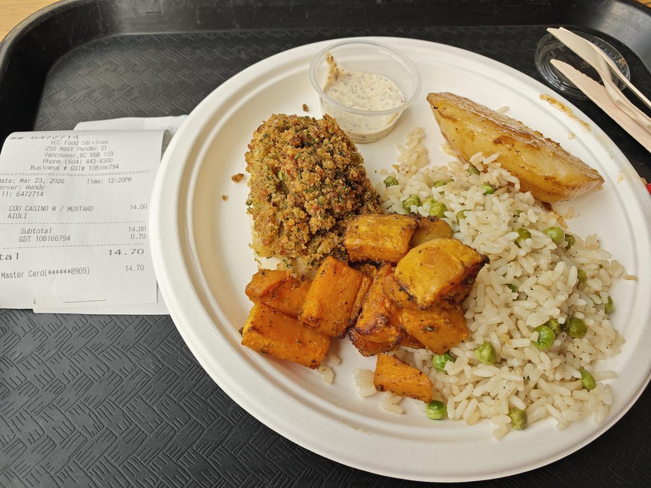 自从在VCC上学以来,从7am起床,9-12am和1-4pm上课,我的午餐基本选择在学校吃,不仅因为它不用给小费,而且它几乎每餐都有鱼: 三文鱼、比目鱼或鳕鱼,外加土豆制品、蔬菜和米饭。一大盒不到15加币,又天天可以吃鱼,感觉很值!