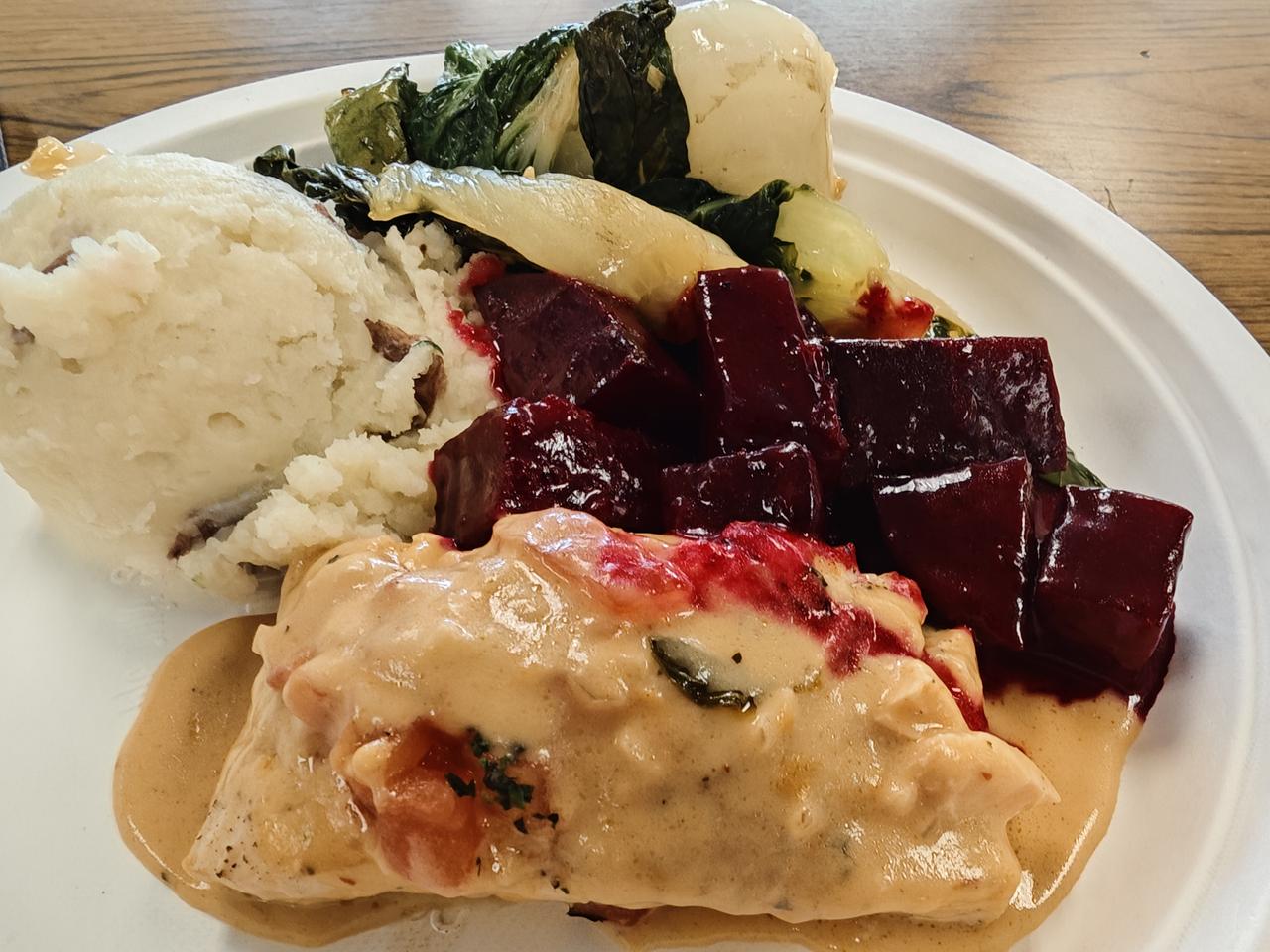今天是茄汁三文鱼、土豆泥、清炒奶油白菜和焖红菜头,没要米饭。感觉在学校吃饭至少品质还是放心的。二楼有面包房,老师经常买来分享,据说是学烘焙的同学做的,价格很便宜,我吃过2次,感觉味道还行!