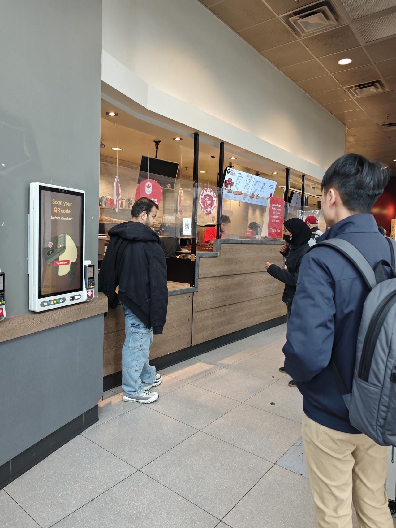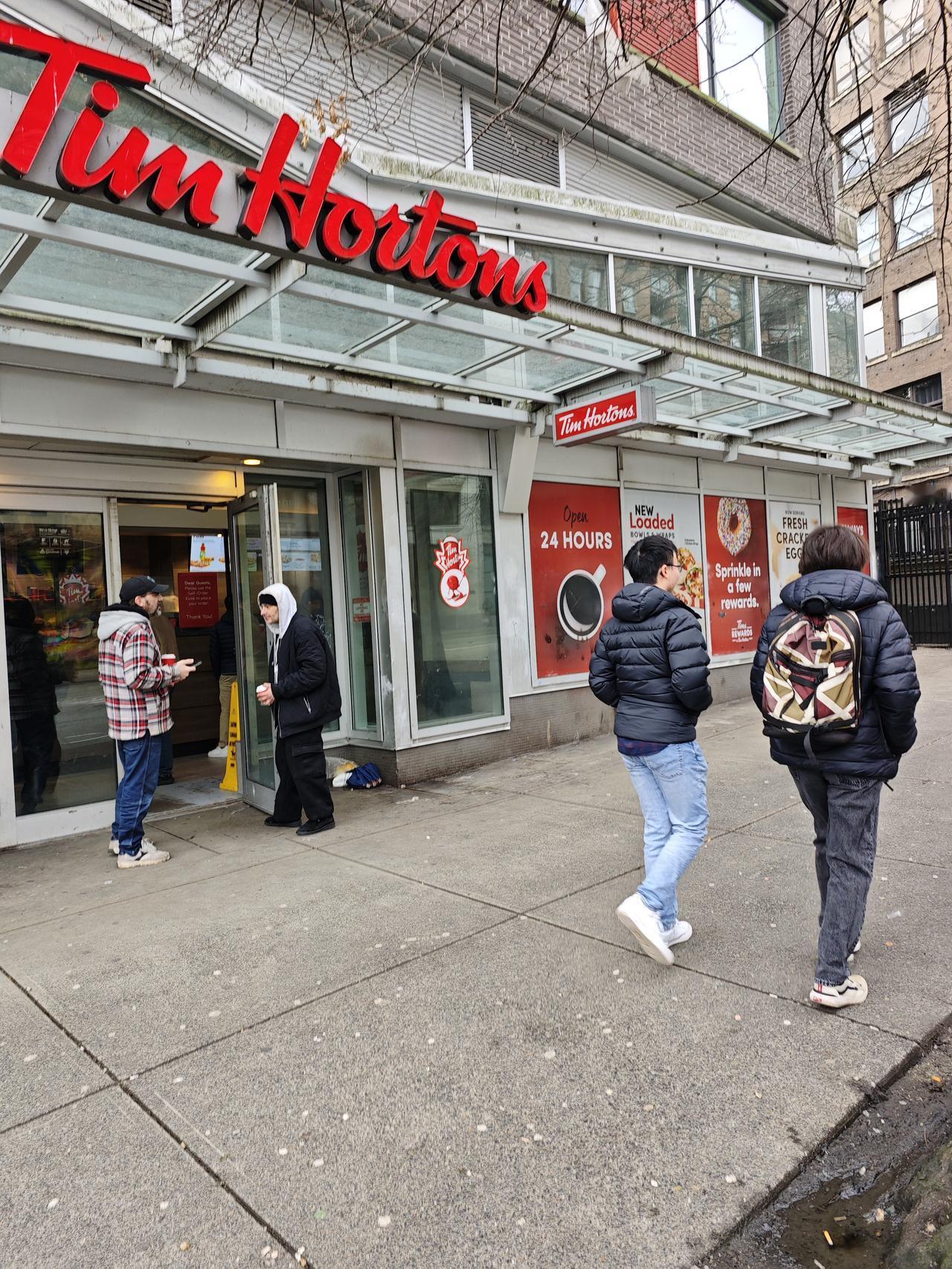 因为是在市中心校区,周边的环境有一点点令人担忧。比如午餐时我们5-6个女同学相约到Tim Hortons喝咖啡,门口有个男人帮拉着门,一边嘟囔着“我可不是免费做这些的”,意思希望给他小费呗。可惜人们鱼贯而入,没一个理会他的,他也不生气。我犹豫了一下,也没理会,从内心而言,我是想给的,毕竟是中国年的初一,发个红包也是应该的,奈何胆小怕事想想也就算了,不能做出头鸟!