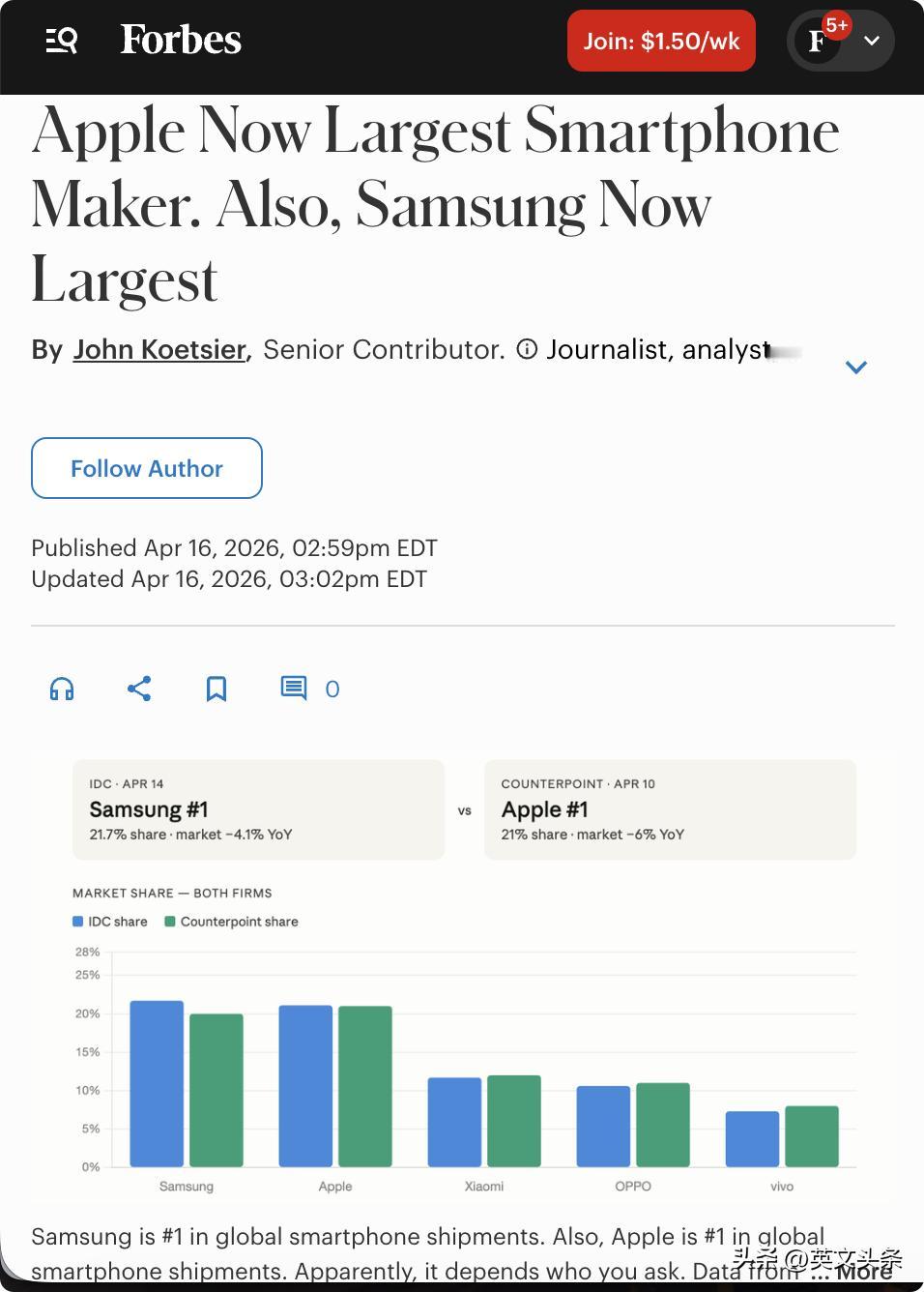 外媒:苹果与三星在全球智能手机市场的争夺战中均名列第一,但数据来源存在分歧。根据Counterpoint的数据显示,苹果在2026年第一季度的智能手机出货量增长了5%,市场份额为21%,而IDC则称三星为第一,年增长率为3.6%,市场份额为21.7%。两家公司在出货量和市场表现上的数据差异源于不同的统计方法和定义,尤其是在如何处理库存数据和出货记录方面。