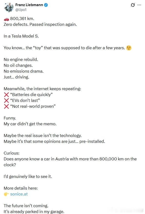 有奥地利网友晒出了他的Model S的年检报告,2015年注册,11年开了80万公里,一点问题都没有