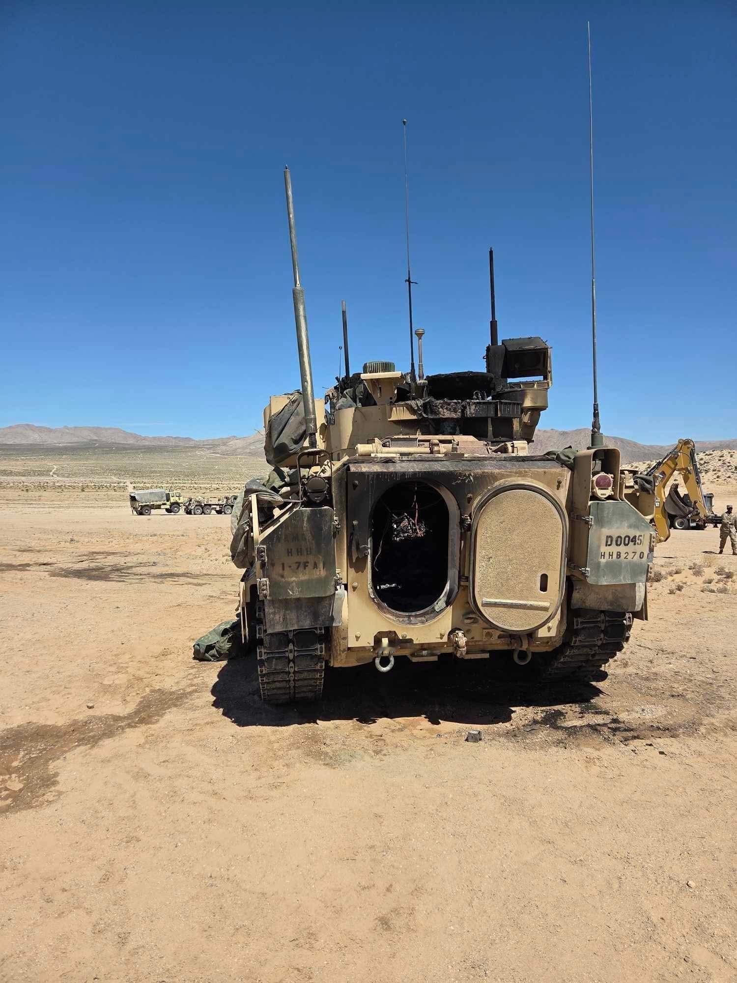 美军傻事 美国欧文堡国家训练中心(NTC),一辆MD三等人的M7A3炮兵侦察车被彻底烧毁