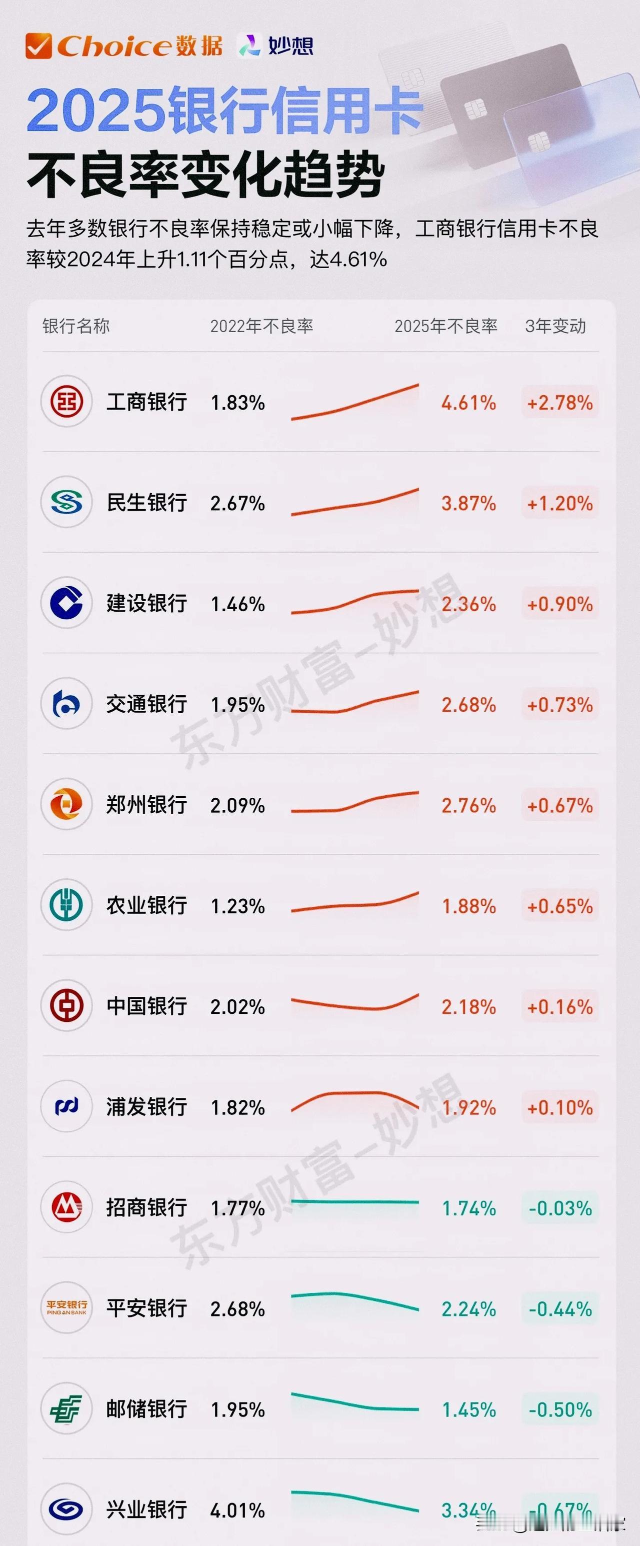- 踩雷阵营(不良率飙升):工行不良率从1.83%涨到了4.61%,三年涨了2.78个百分点,民生、建行也都明显上升,说明之前放出去的钱,现在收不回来了。