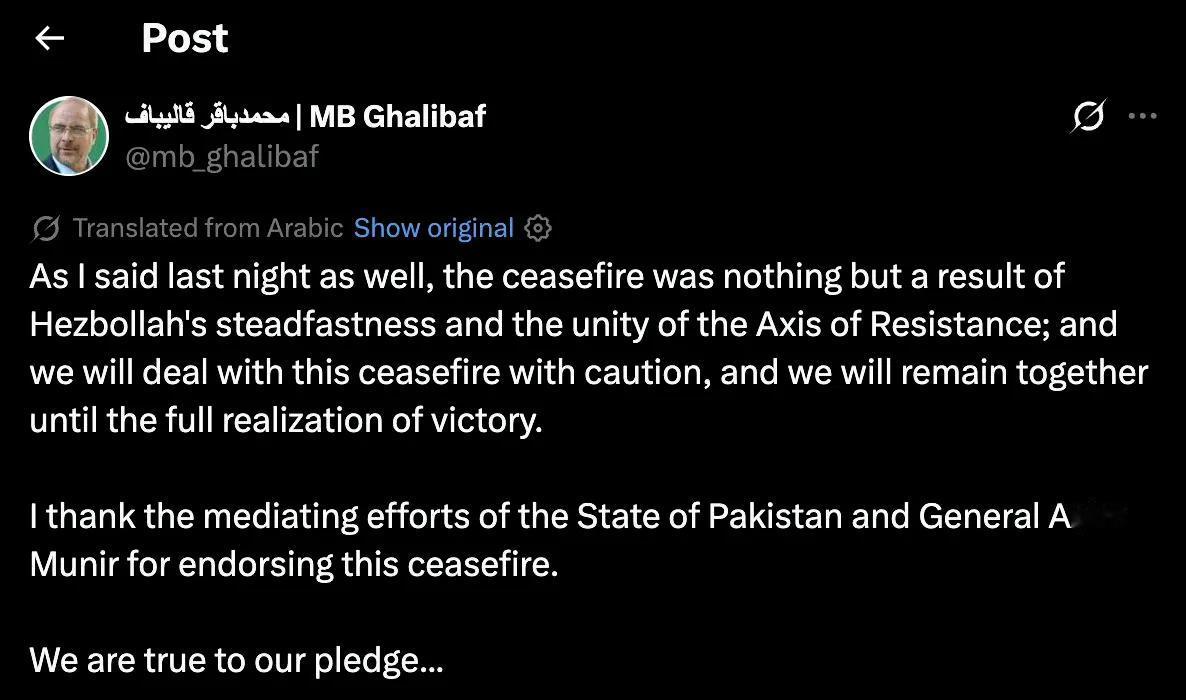 伊朗议长卡利巴夫对于黎巴嫩停火,在社交媒体上发帖表示:“停火不过是真主党坚定立场和抵抗轴心团结一致的结果;我们将谨慎对待这次停火,并将继续团结一致,直至胜利完全实现。我感谢巴基斯坦国和陆军参谋长阿西姆·穆尼尔将军为促成此次停火所做的斡旋努力。”