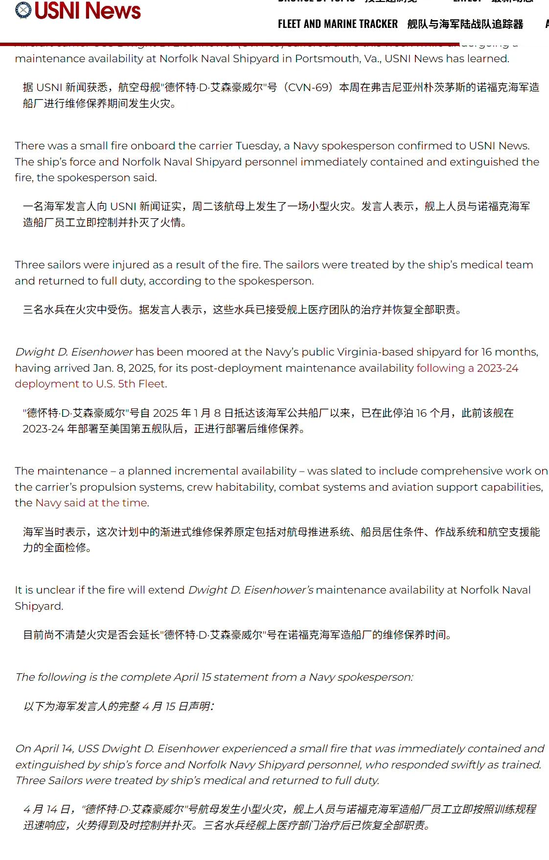 据福克斯新闻报道,美国海军新闻发言人表示,火灾导致三名水兵轻伤,在接受船上医疗队的治疗后,现已恢复全部执勤任务。目前尚不清楚是什么原因导致的火灾,美国海军表示正在调查中。