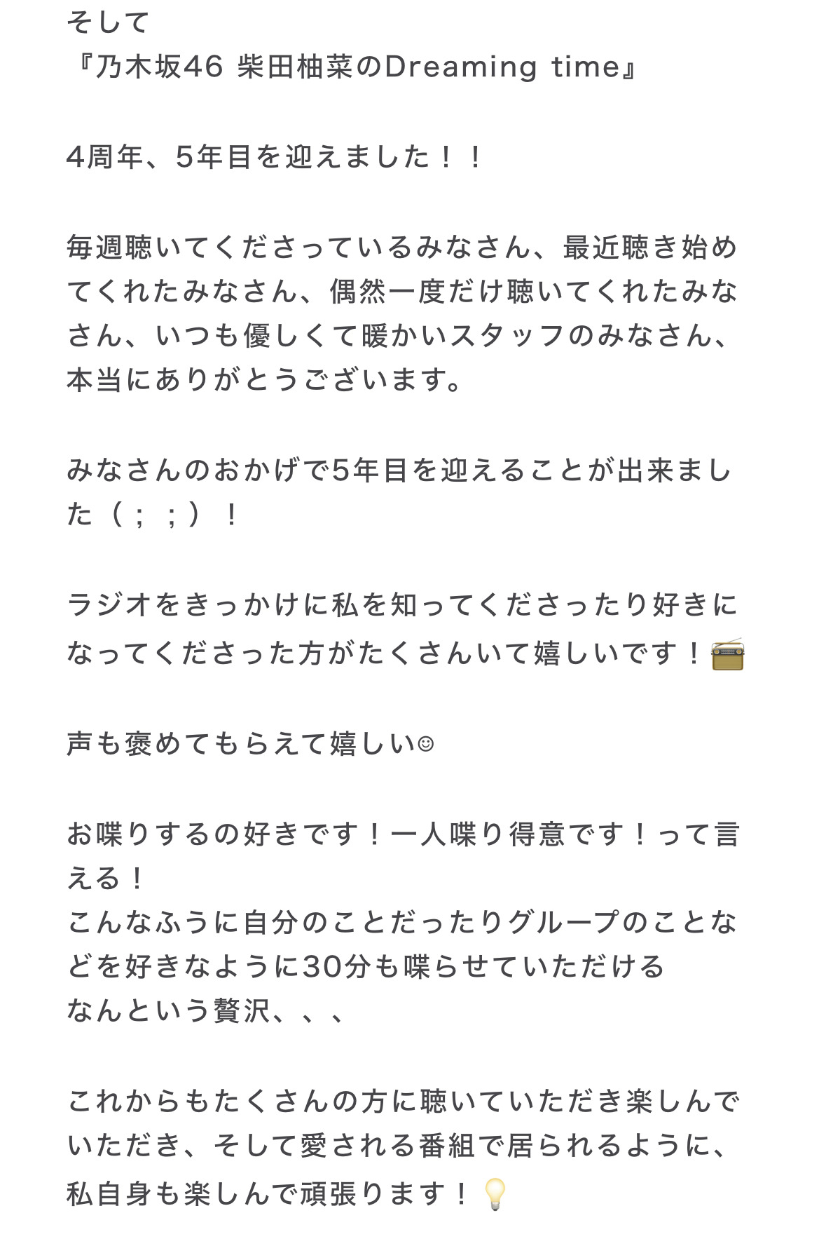 ゆな「『乃木坂46 柴田柚菜のDreaming time』4周年、5年目を迎えました!!毎週聴いてくださっているみなさん、最近聴き始めてくれたみなさん、偶然一度だけ聴いてくれたみなさん、いつも優しくて暖かいスタッフのみなさん、本当にありがとうございます。みなさんのおかげで5年目を迎えることが出来ました( ; ; )!」