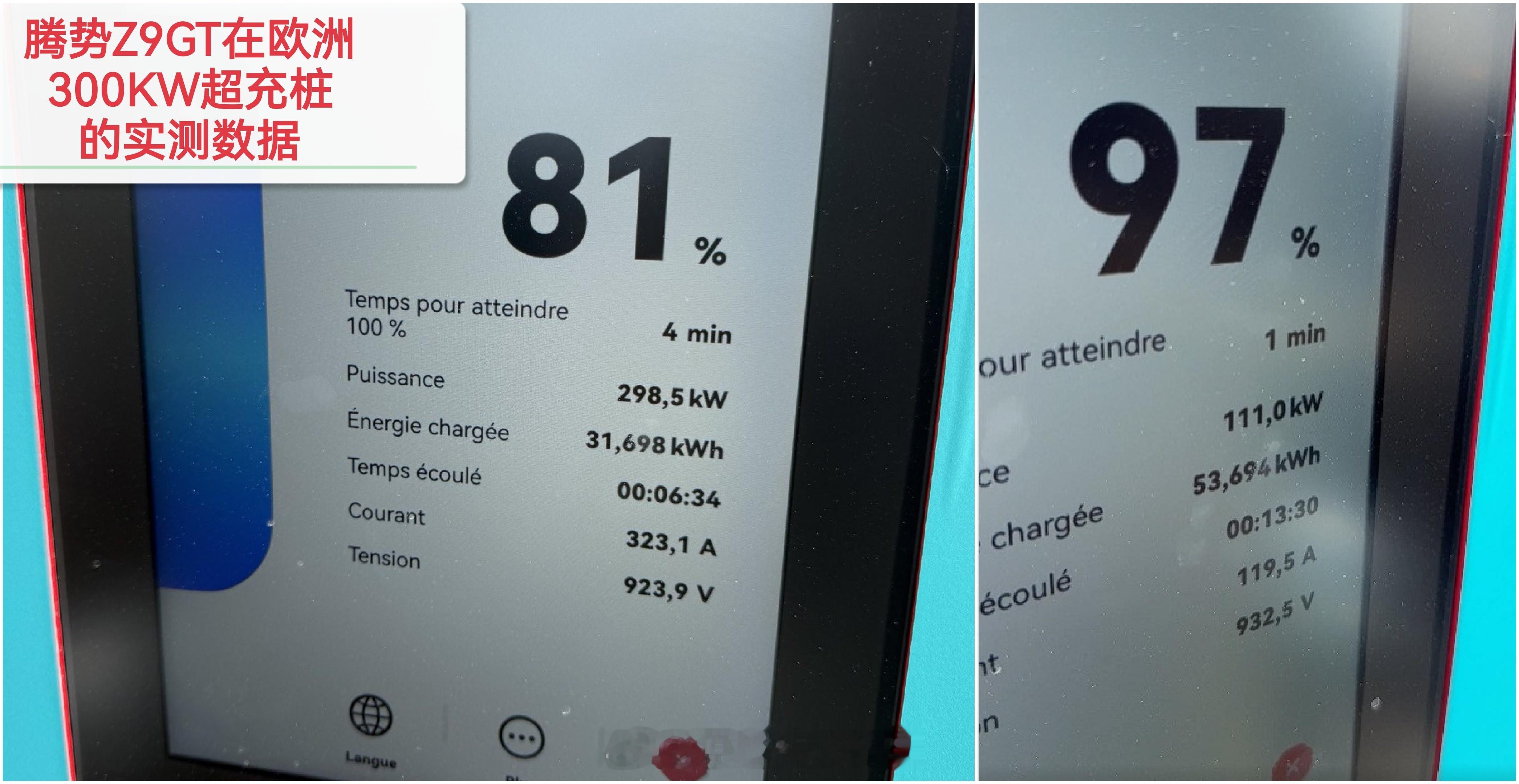 看一看腾势Z9GT纯电闪充版在欧洲目前主流的300KW公共超充桩上的实测充电表现(图1),简直屌爆了~