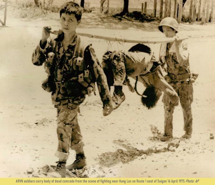 一张美联社于 1975 年 4 月 16 日拍摄的照片,照片显示两名年轻的南越士兵在西贡以东 1 号公路附近的雄禄(Hung Loc)战斗中,用一根临时杆子抬着他们阵亡的战友。