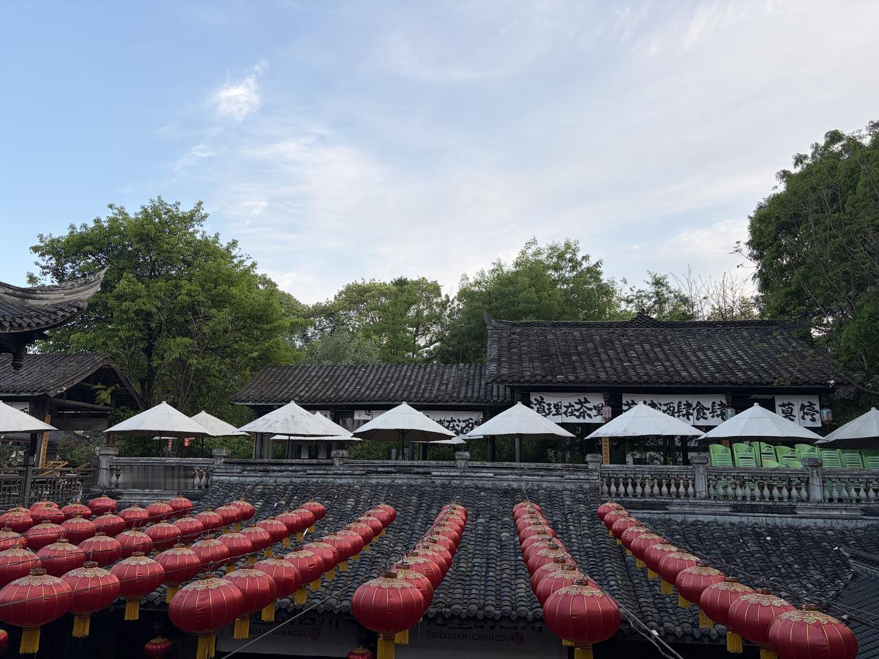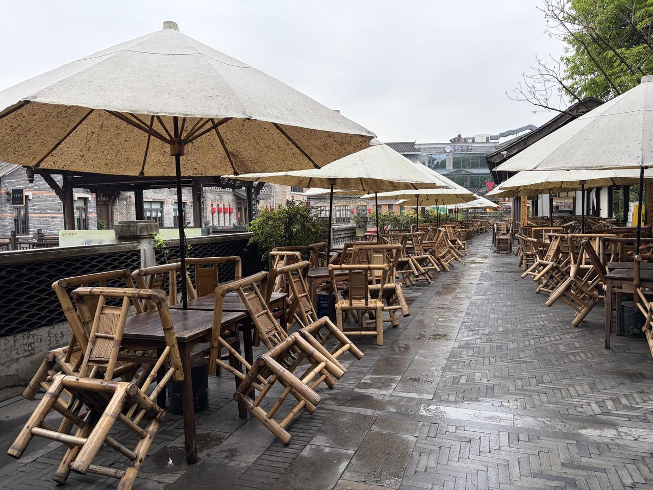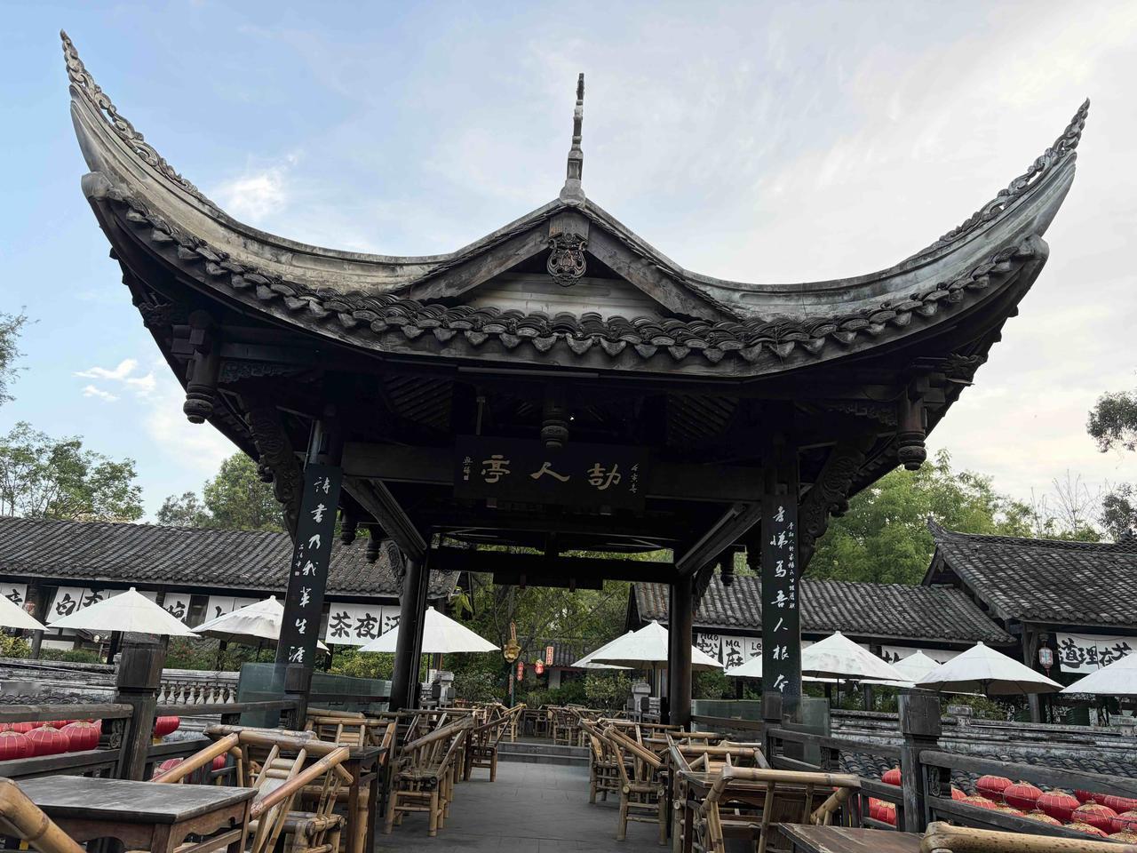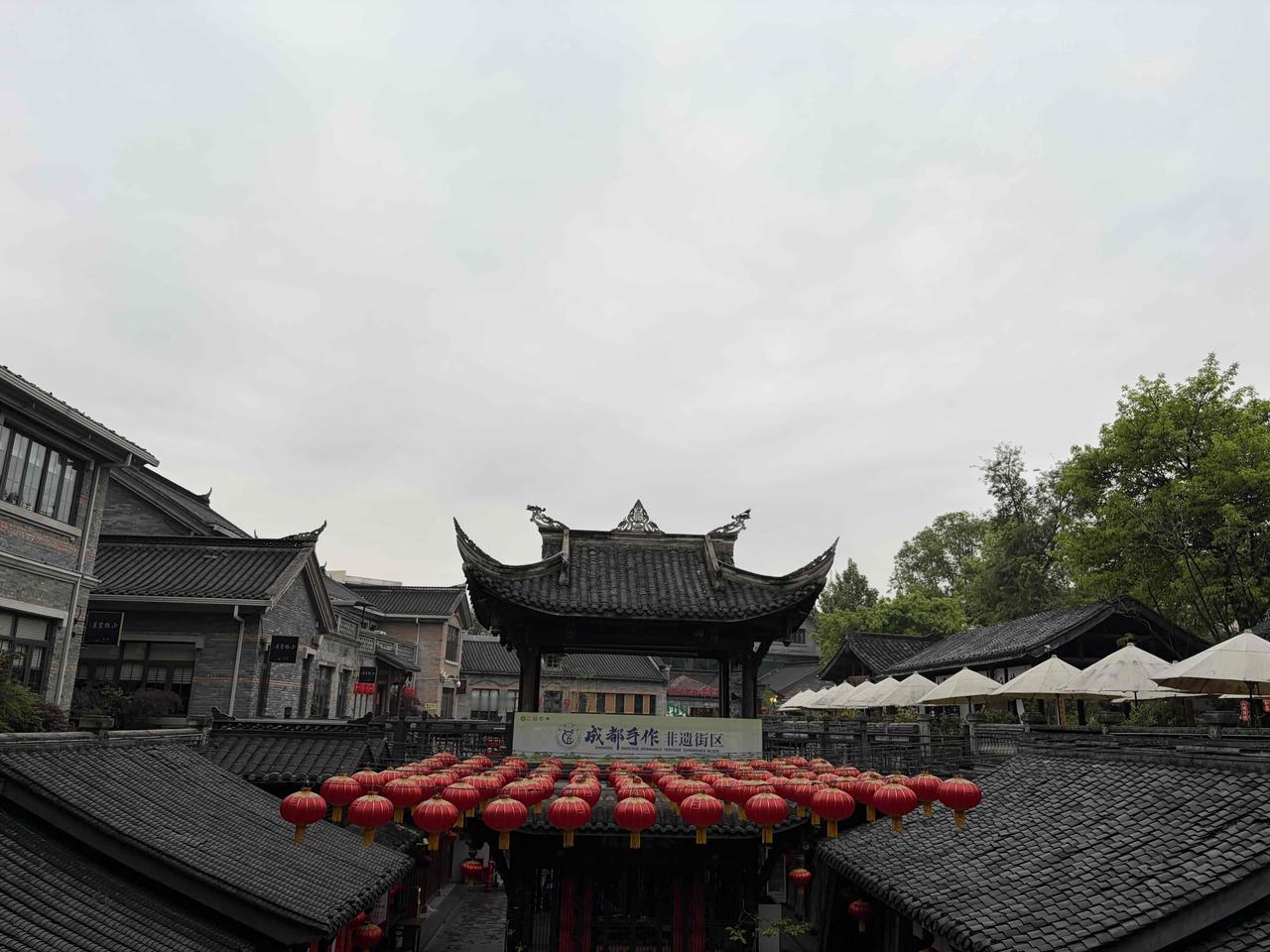 医院对面,有着一个鲜活的成都。檐角飞翘的亭子里,竹椅排排,红灯笼在青瓦上晃着暖光。远处的老茶馆飘着茶烟,写着“莫停”的布幡被风掀起,像一句温柔的挽留。街边的小店摆着豆花鱼、老卤肥肠的海报,烟火气直往鼻尖钻。