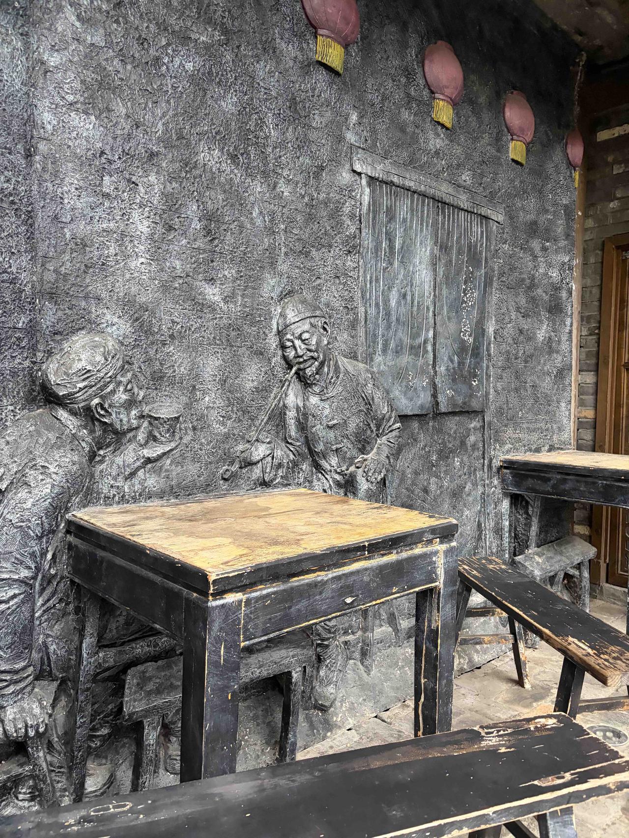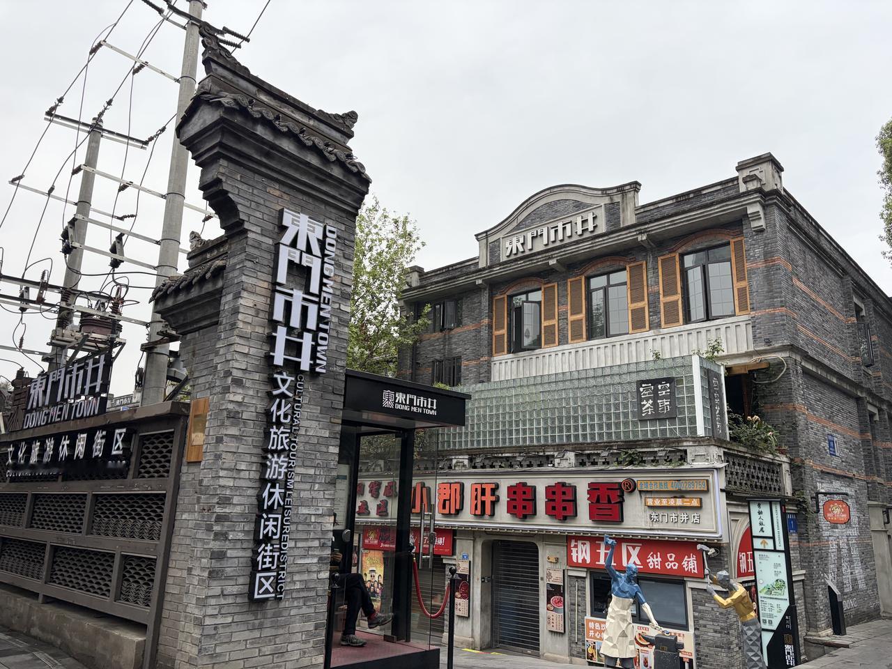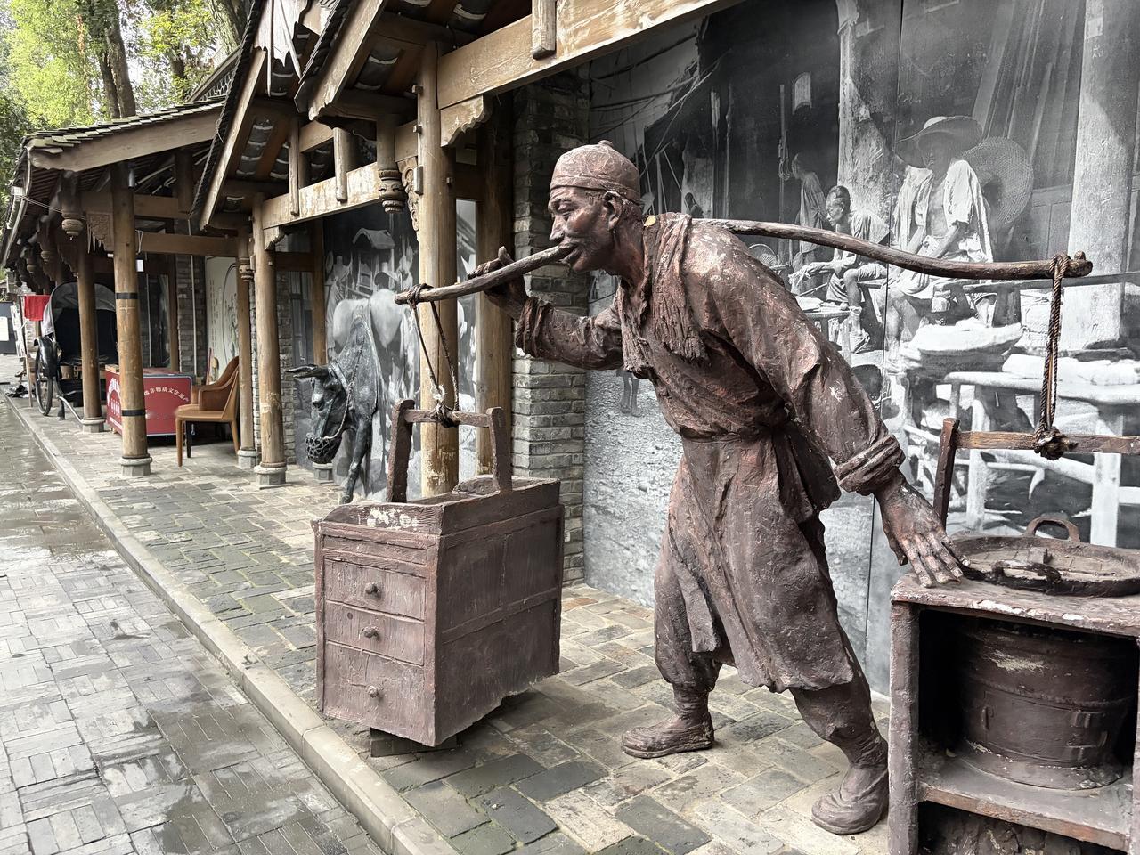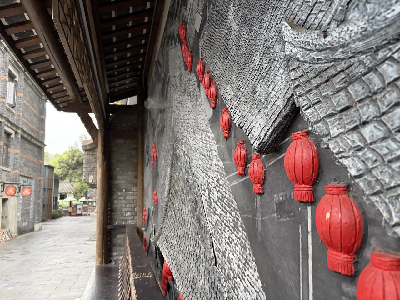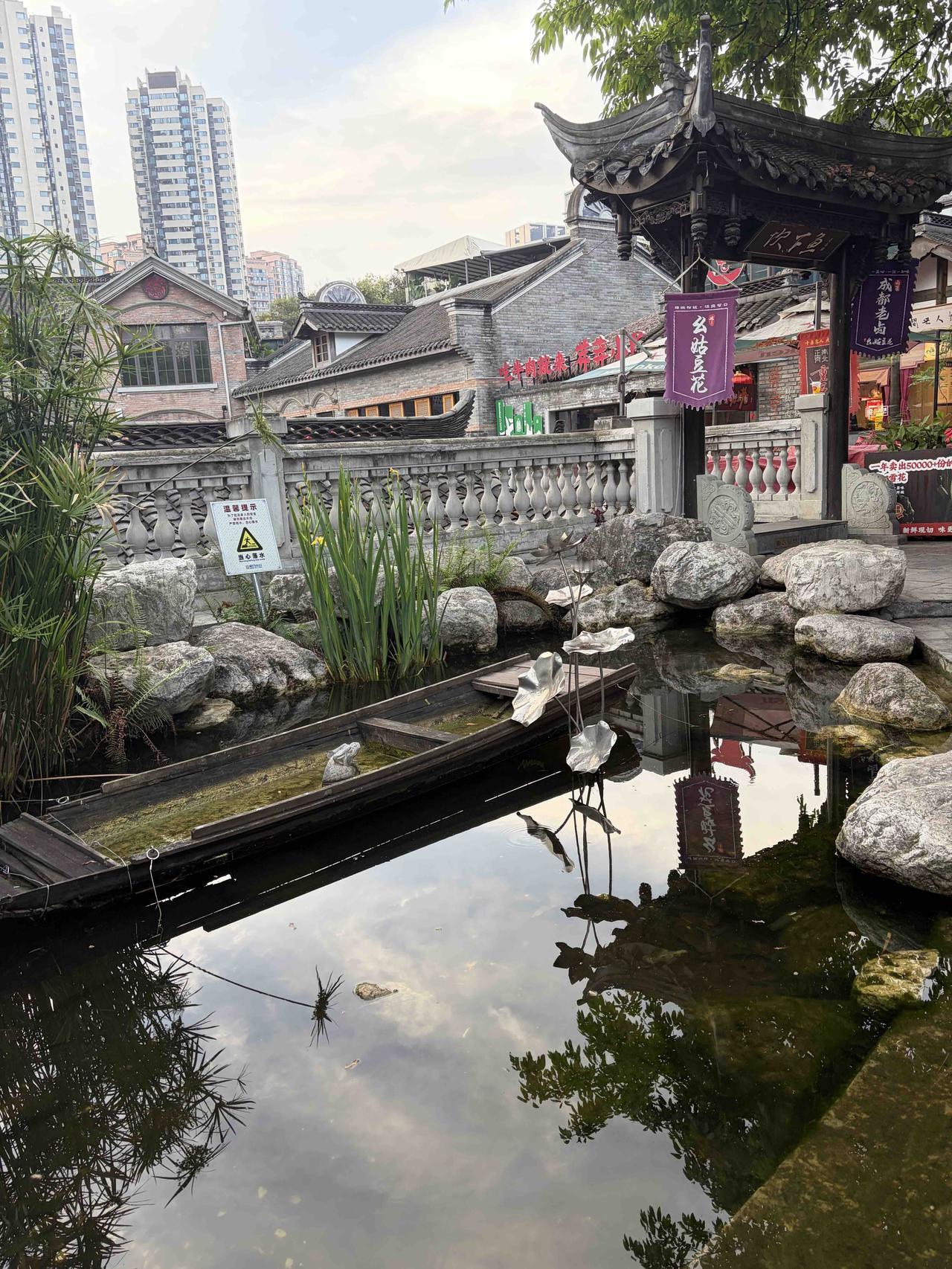 医院对面,有着一个鲜活的成都。檐角飞翘的亭子里,竹椅排排,红灯笼在青瓦上晃着暖光。远处的老茶馆飘着茶烟,写着“莫停”的布幡被风掀起,像一句温柔的挽留。街边的小店摆着豆花鱼、老卤肥肠的海报,烟火气直往鼻尖钻。