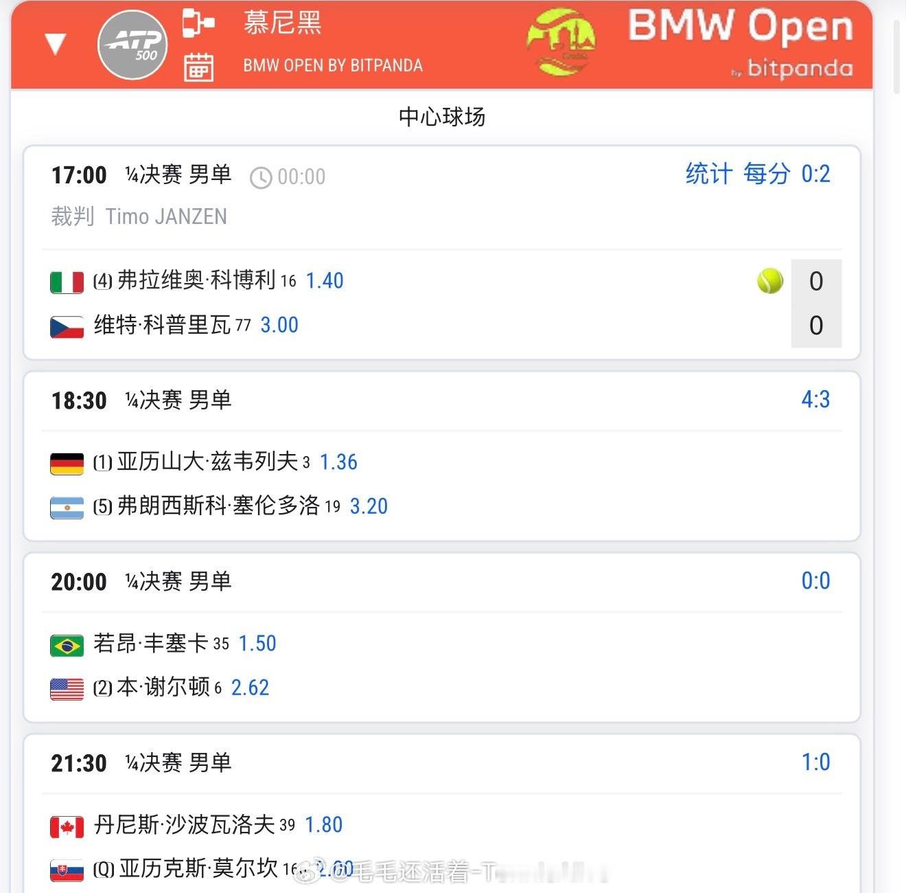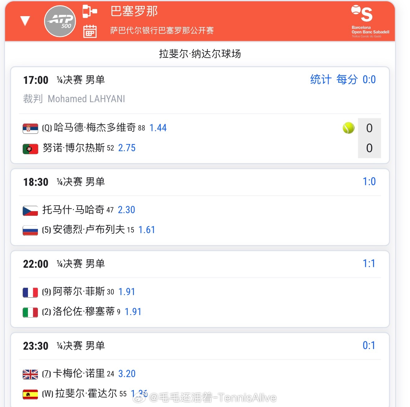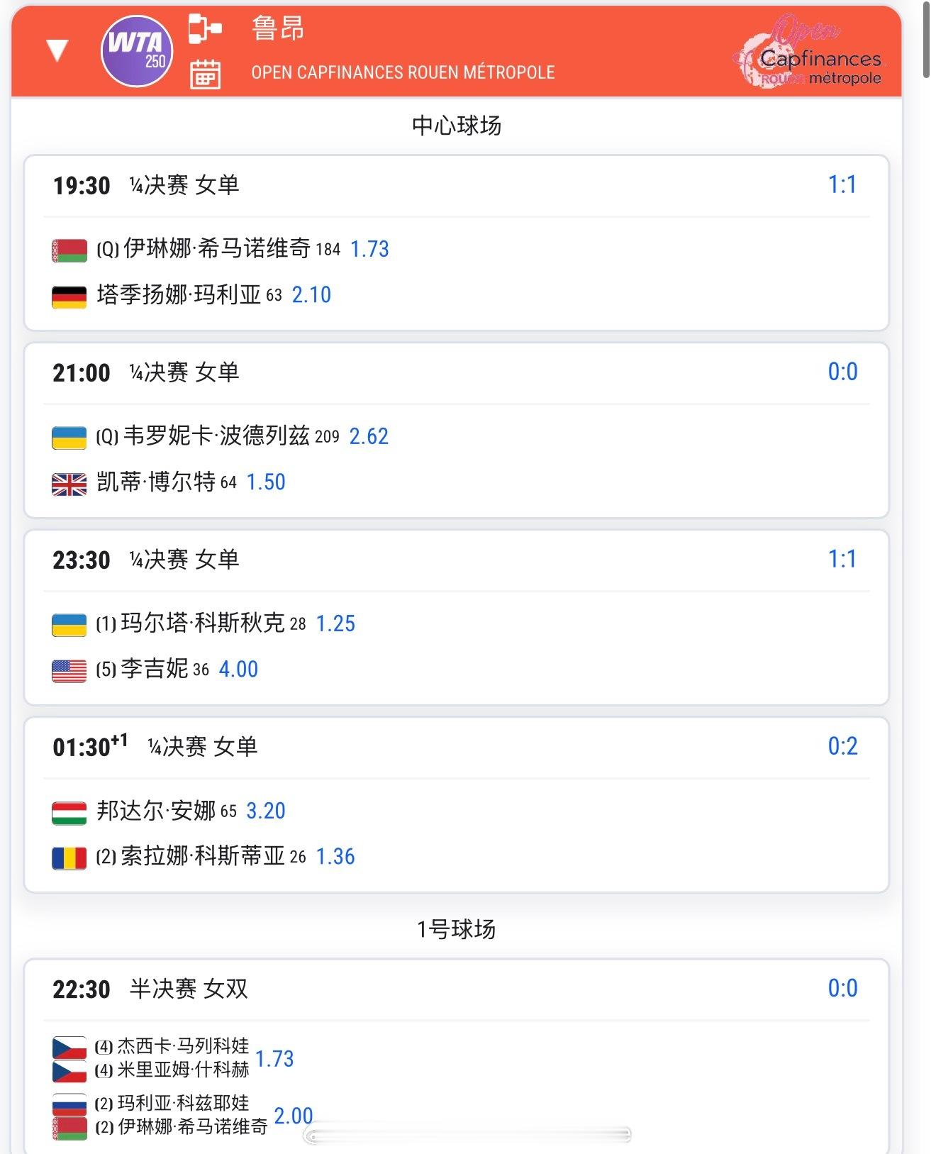 20:30高芙vs穆霍娃23:00斯瓦泰克vs安德列娃1:00莱巴金娜vs费尔南德斯