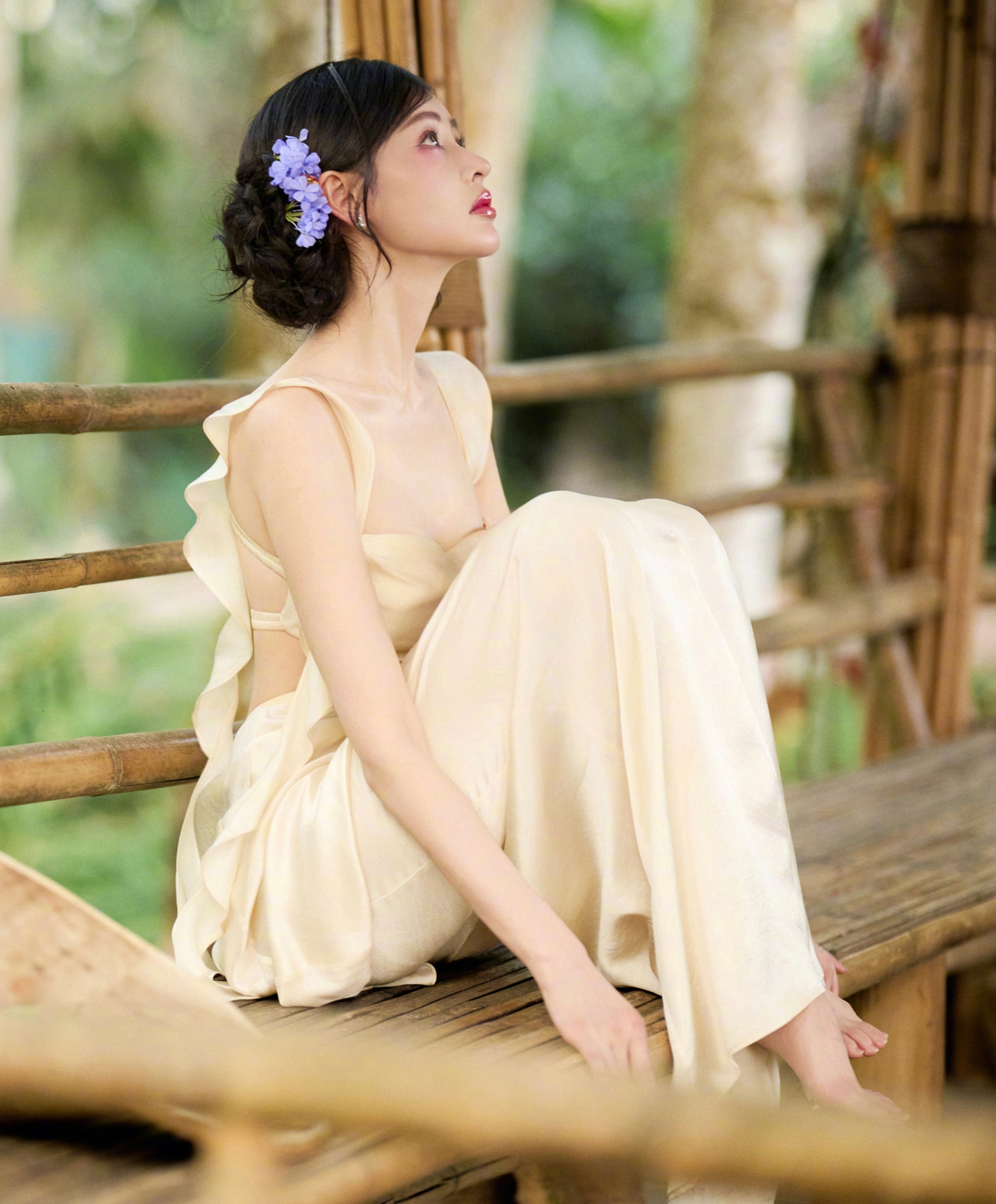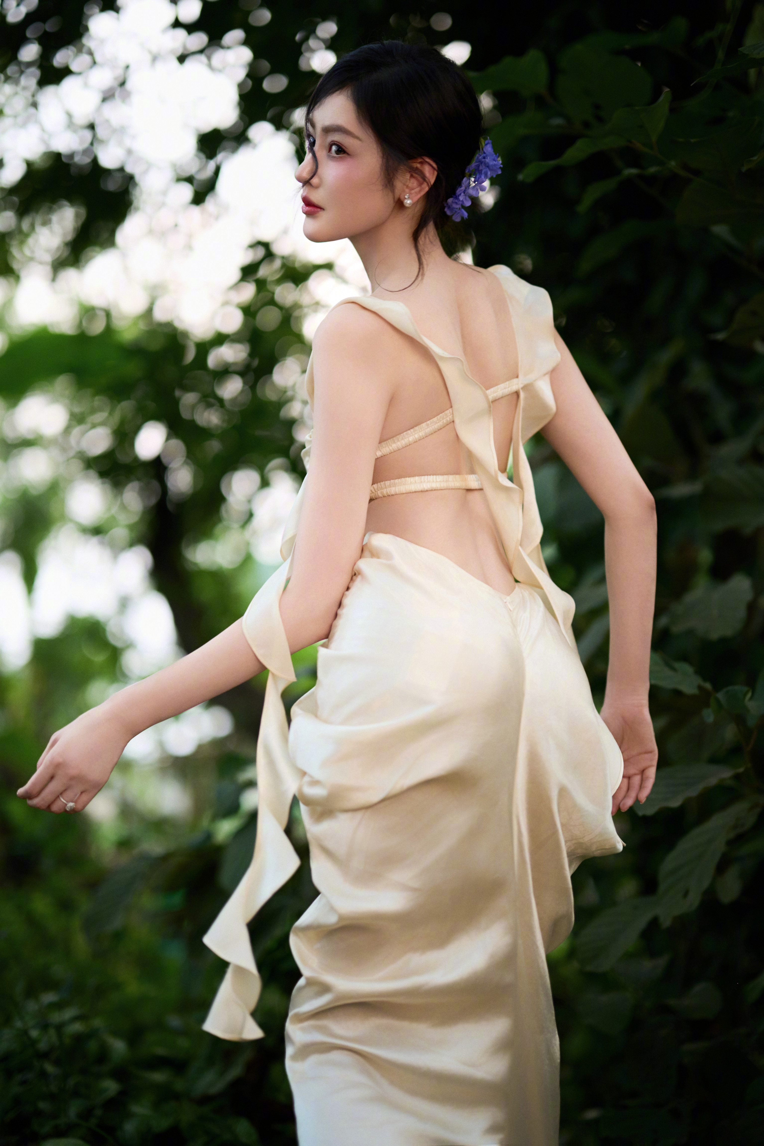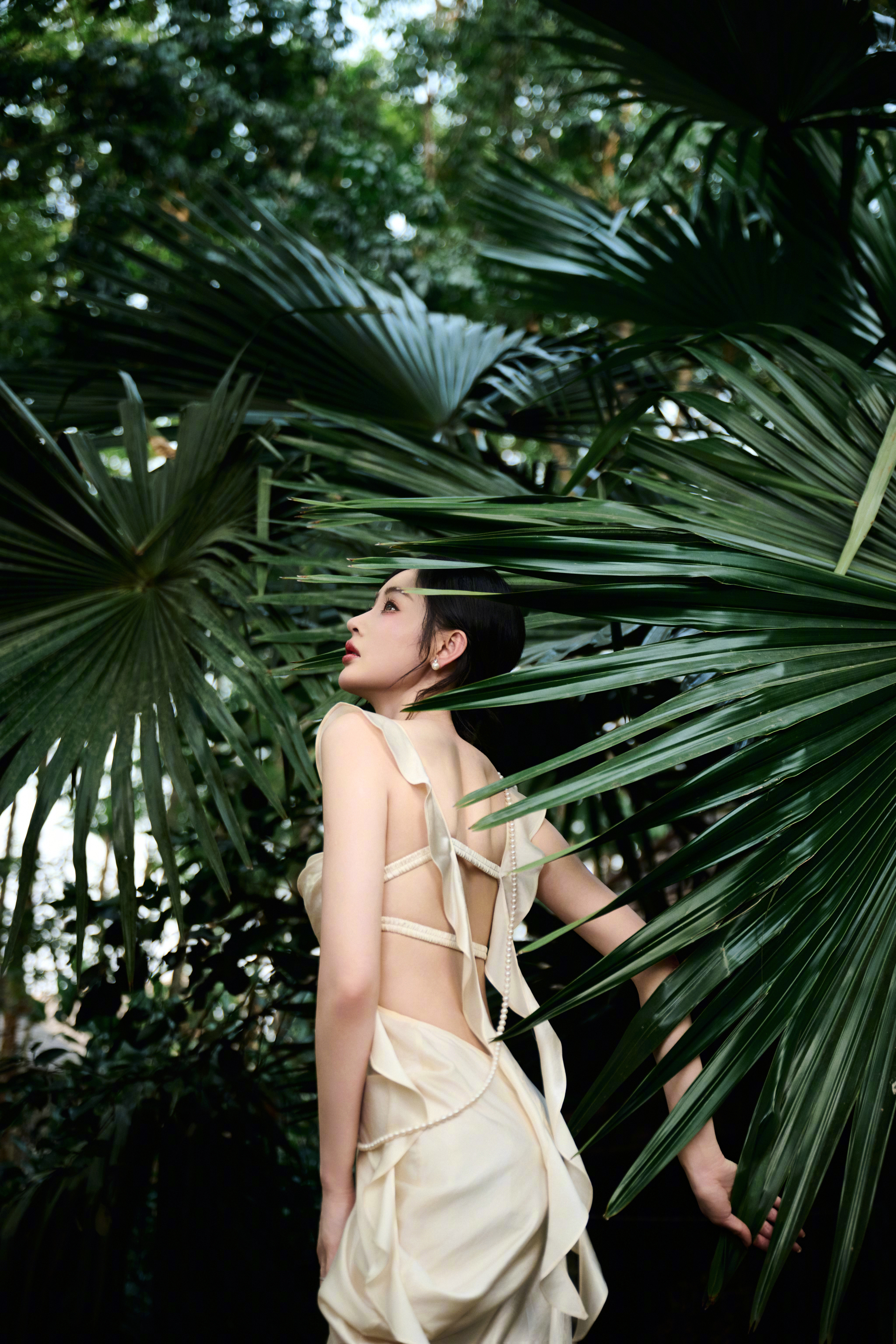 张天爱 浅黄长裙勾勒出曼妙身姿,慵懒与优雅并存,她就是这片绿意中最动人的风景。
