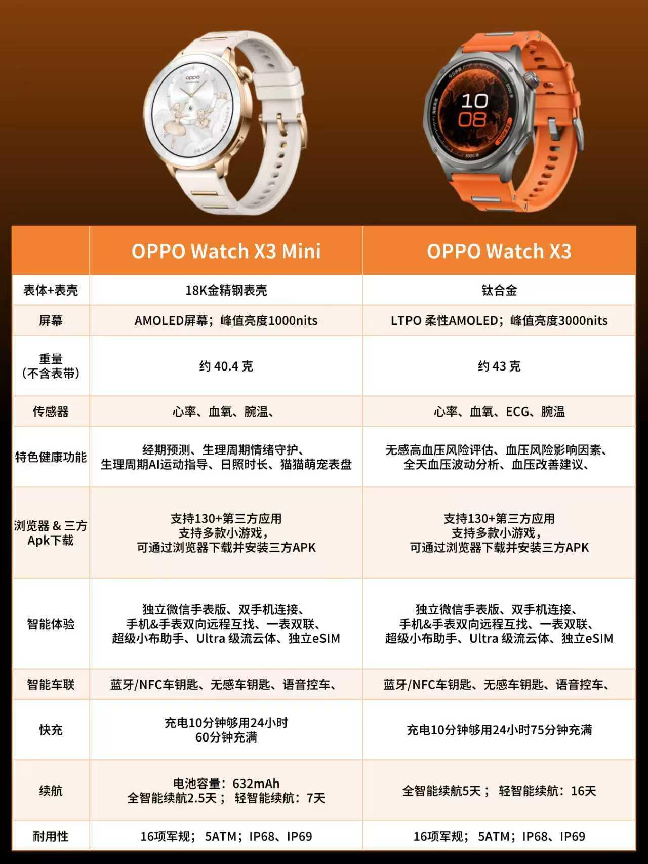 总体来看,X3适合追求专业健康数据、耐续航、大屏高质感的男生。X3 Mini轻巧时尚精致,更适合女生或手腕细的用户。选哪个,就看大家的喜好和需求来