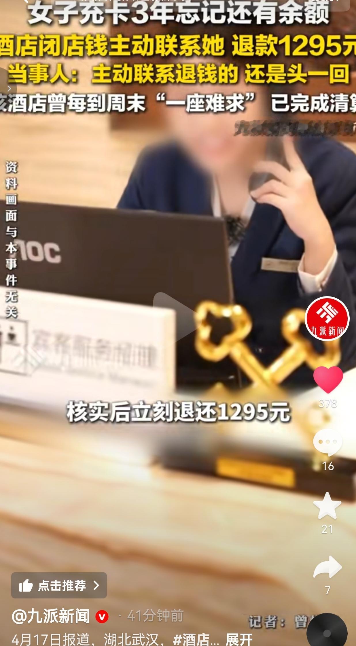 谁能想到,这家曾经周末都一座难求的酒店,闭店清算前,居然专门翻出了她的联系方式,主动联系她,把卡里剩下的1295块一分不少地退了回来!