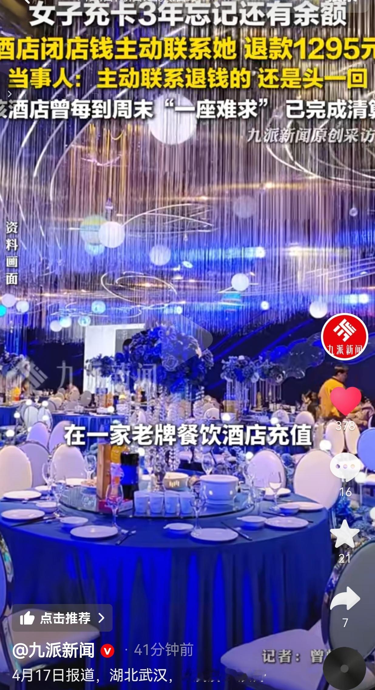 可这家酒店呢?都要关门解散了,都要清算完事儿了,却没有把顾客的钱当成自己的“意外之财”,反而认认真真核对了每一笔储值,挨个联系退款。
