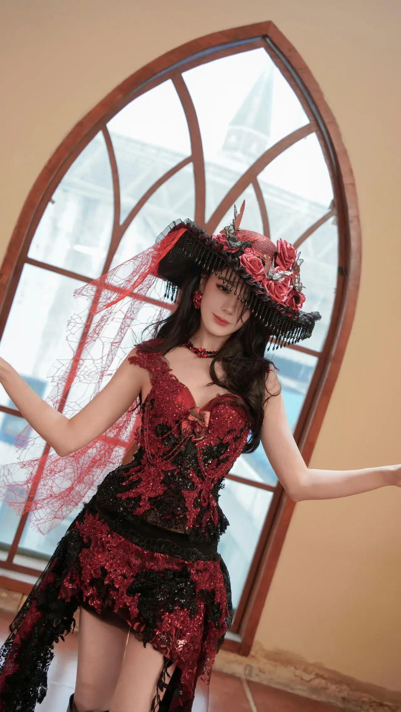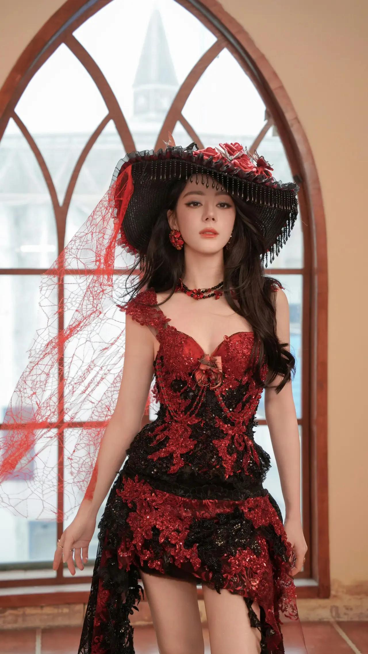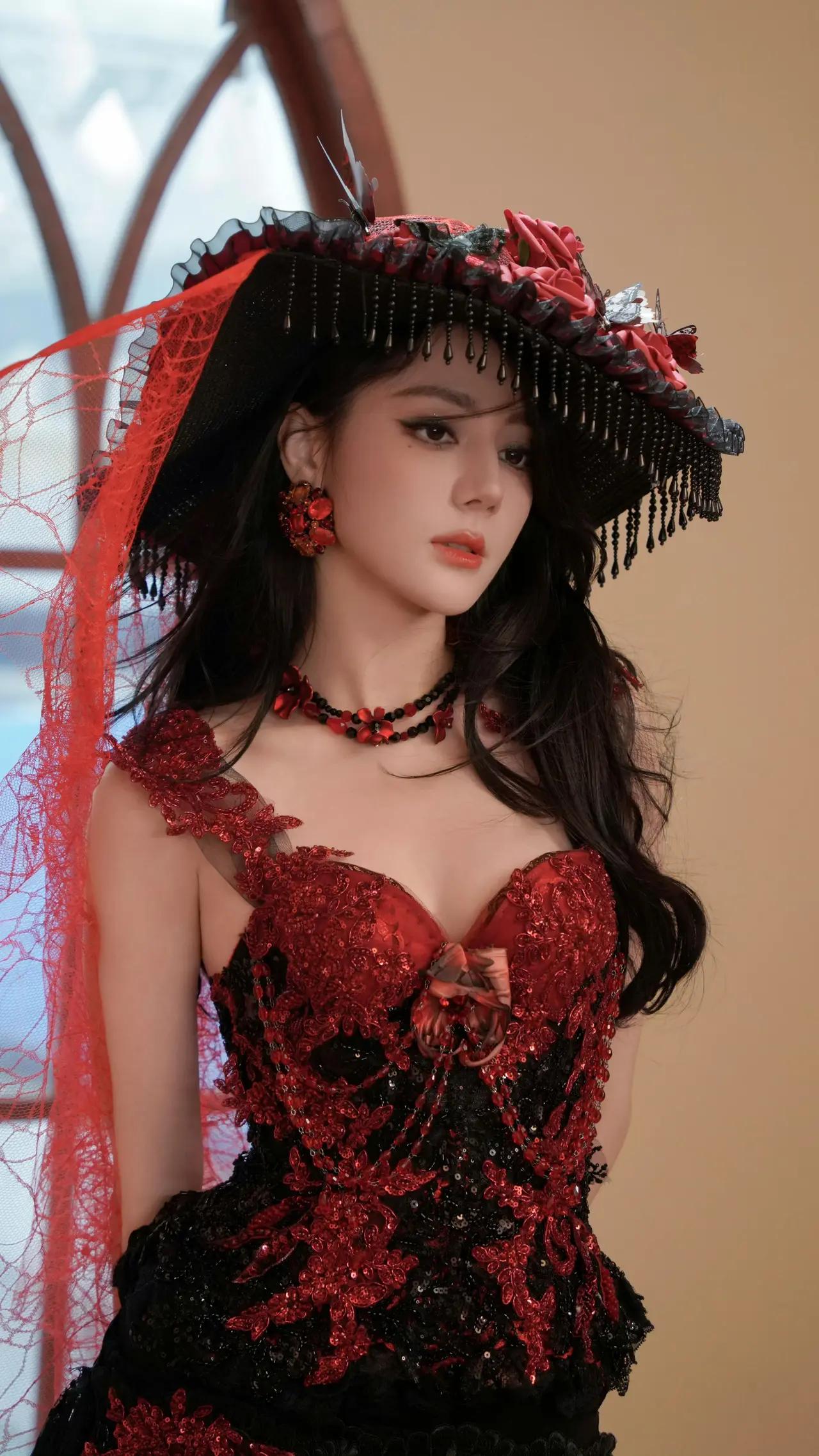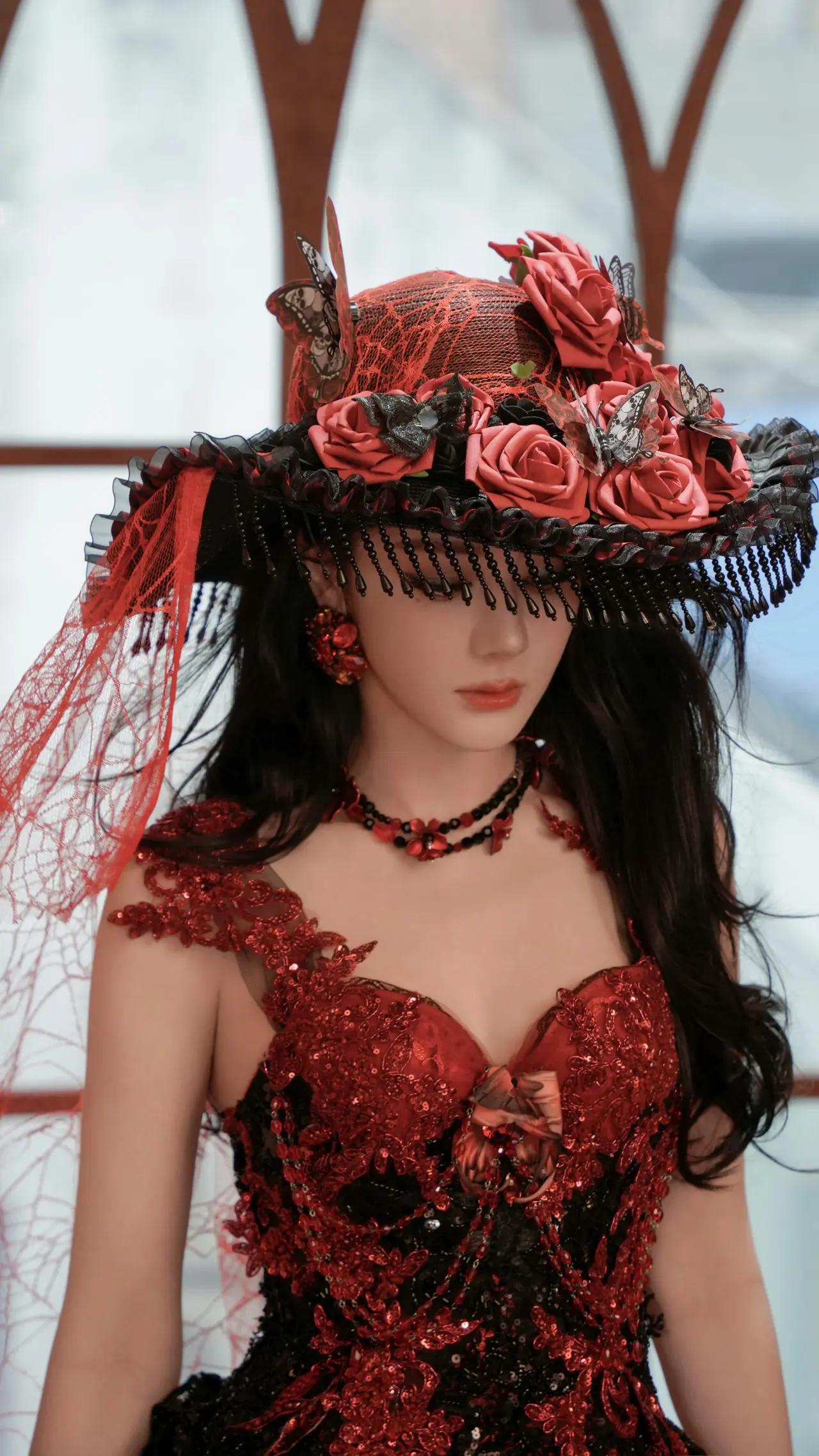 美女壁纸~迪丽热巴,黑红交织的复古绮梦里,礼帽上的玫瑰与蝴蝶缀满风情,蕾丝与亮片流淌着暗夜贵族的贵气 明艳的红与深邃的黑碰撞出致命张力,像一朵带刺的玫瑰,热烈又神秘,每一处细节都写满了又野又贵的氛围感