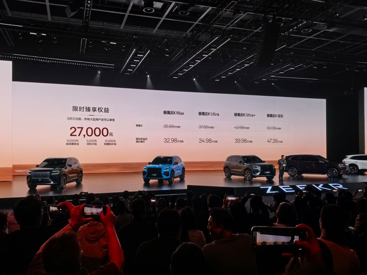 极氪品牌基于浩瀚-S超级电混架构打造的极氪8X正式上市,推出Max、Ultra、Ultra+及曜影版,限时售价32.98万元起,曜影版47.38万元,以性能、智能、安全、舒适四大维度,冲击海外豪华品牌垄断的高性能SUV市场。