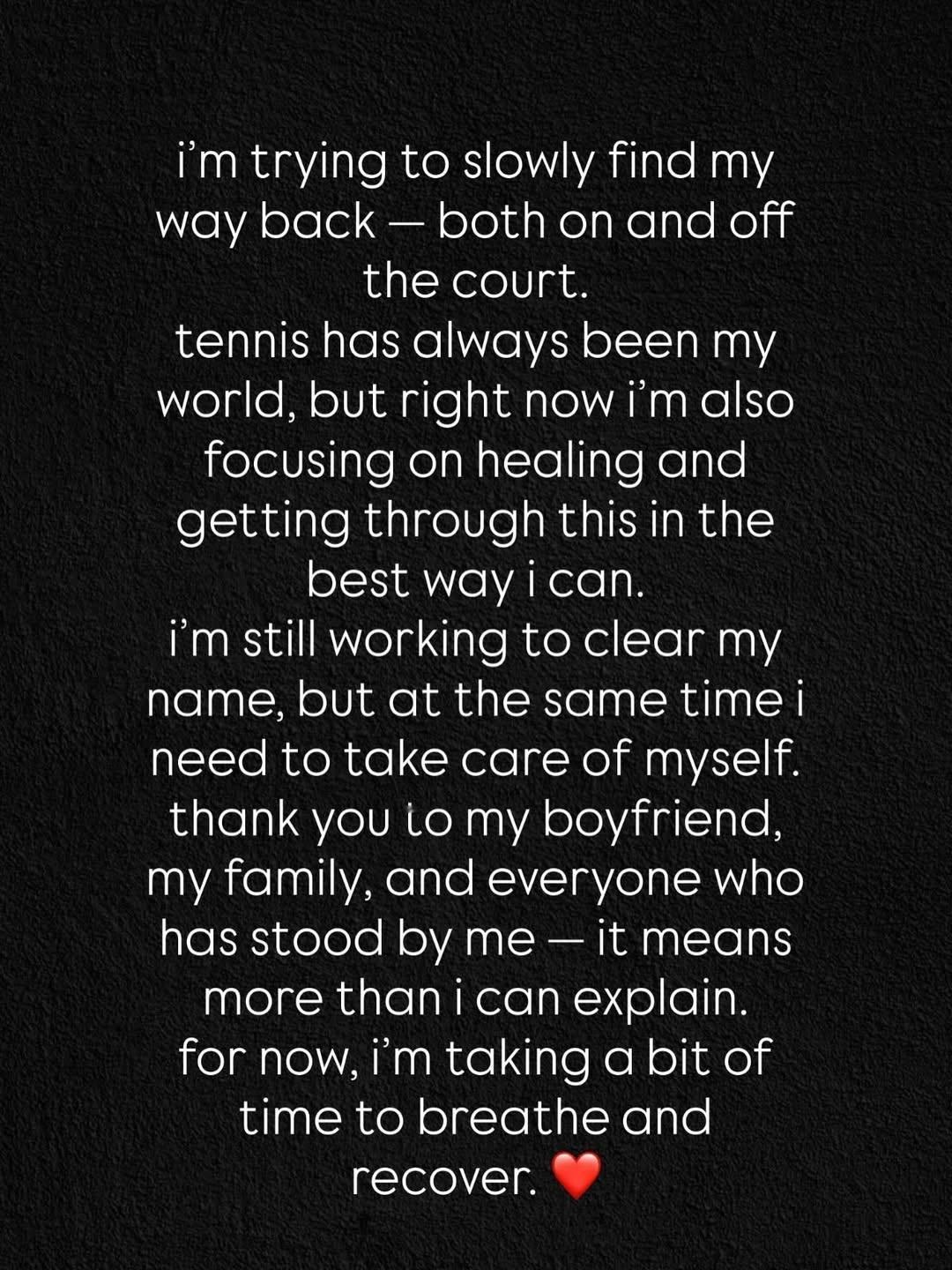 我正在努力慢慢找回自己——无论是在球场上还是生活中。网球一直是我的全部,但现在,我也在专注于疗愈,尽我所能度过这段艰难时期。