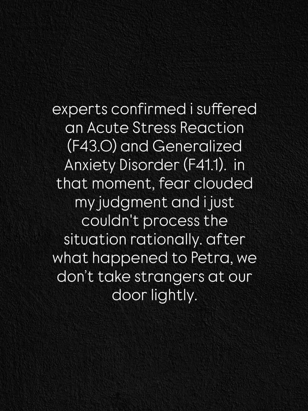 专家确认我患有急性应激反应(F43.0)和广泛性焦虑障碍(F41.1)。在那时,恐惧蒙蔽了我的判断力,我根本无法理性地处理眼前的情况。自从佩特拉(科维托娃)遭遇过那件事后(入室伤人),我们绝不会轻易给陌生人开门。
