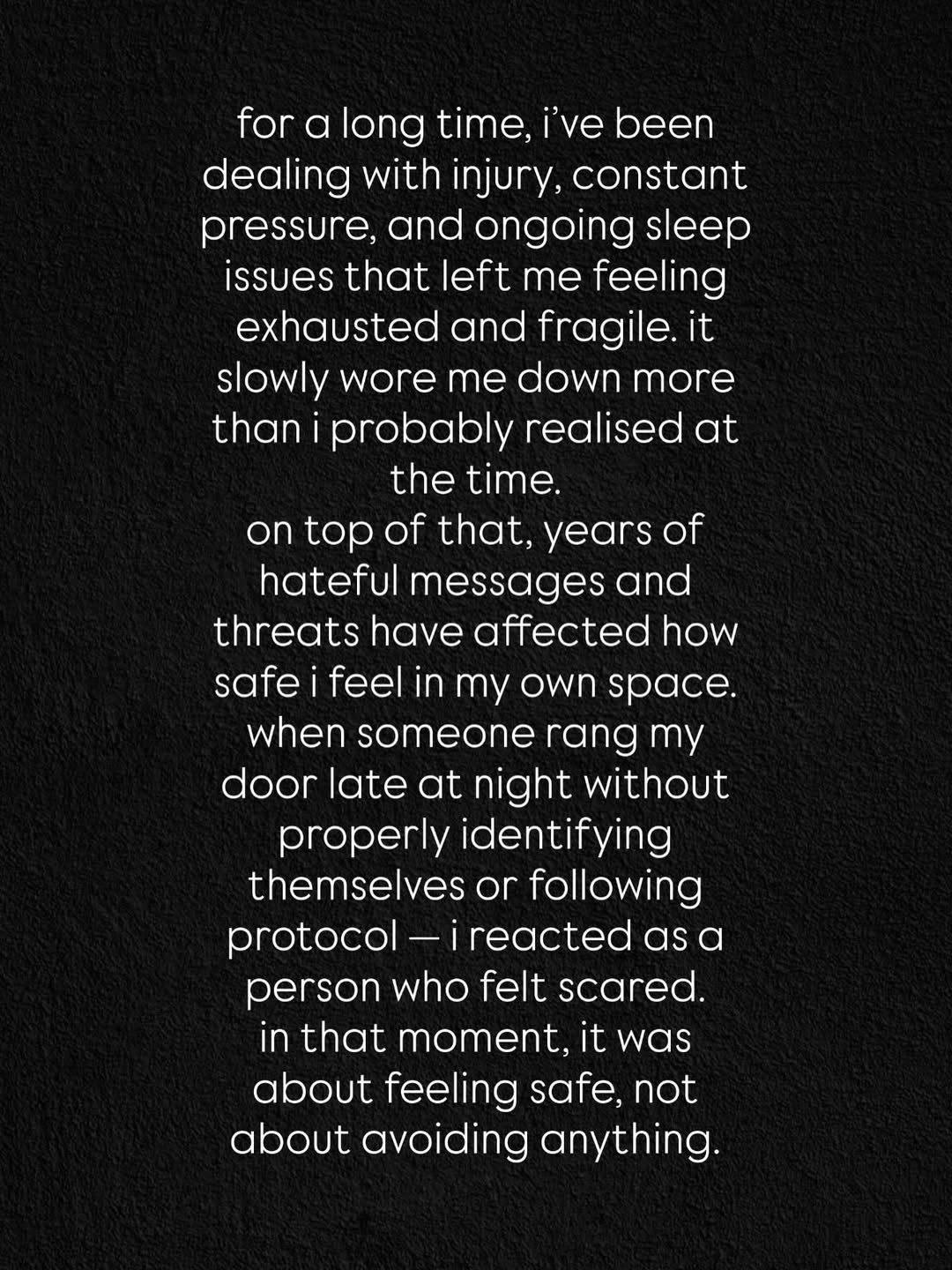此外,多年来的恶意留言和威胁,让我在自己熟悉的环境中也难以感到安全。当有人深夜按我家门铃,却没有按规定表明身份或遵循程序时——作为一个感到恐惧的人,我做出了本能反应。那一刻,我只想确保自己的安全,而不是要逃避什么。