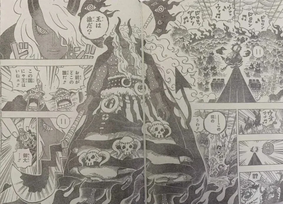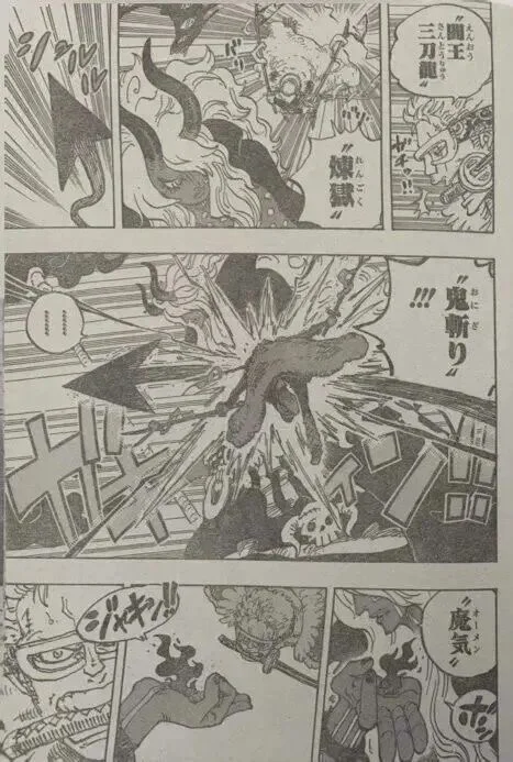 🔸索隆使用“阎王三刀龙 炼狱鬼斩”攻击伊姆,但伊姆用尾巴挡下了攻击。随后伊姆制造出一种名为“魔气”的小型黑色火焰,并将其投向索隆的脸,使其脸部流血。