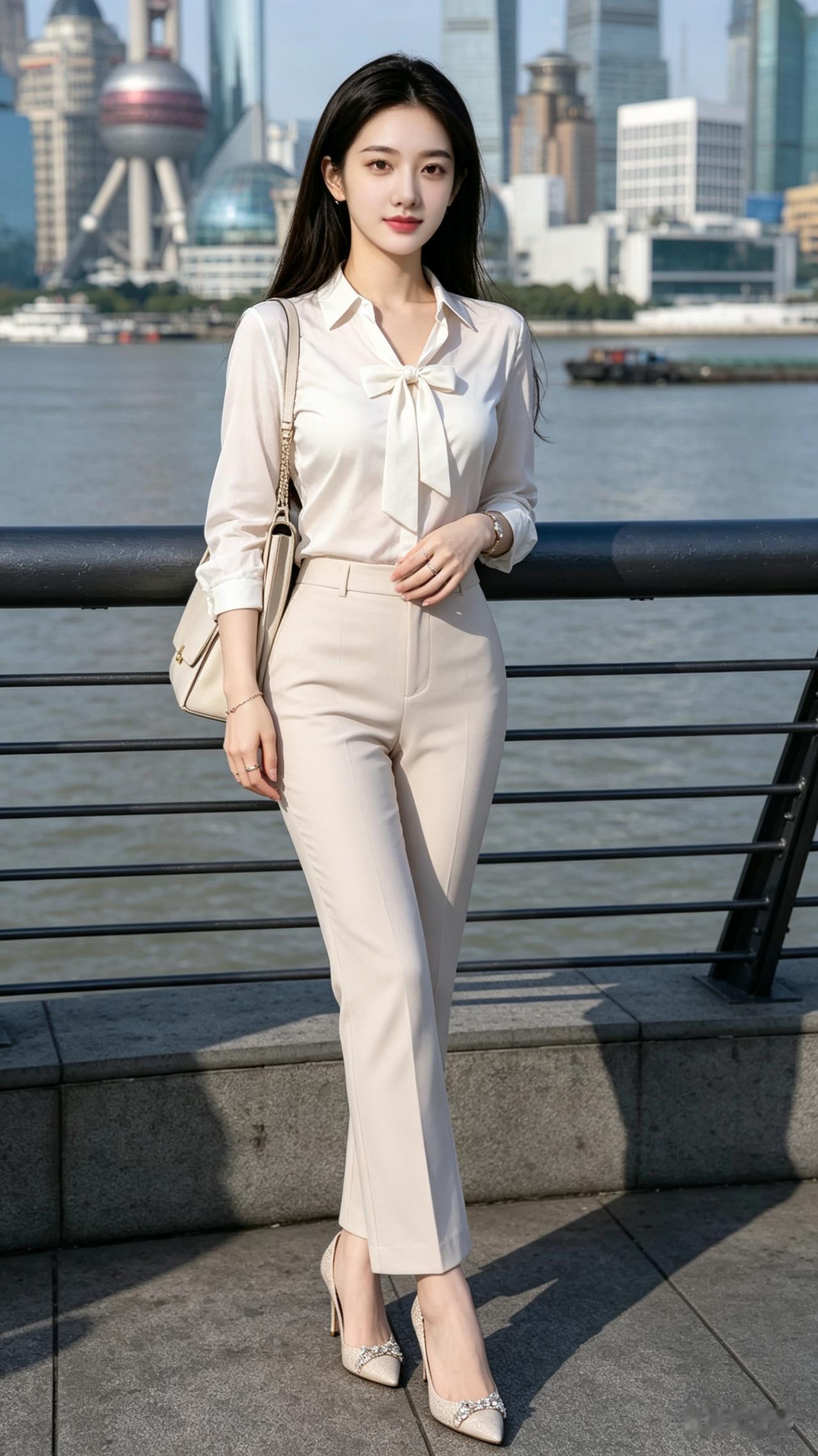 都市雅致风,白色衬衫+米色西裤,搭配高跟鞋,尽显时尚魅力!