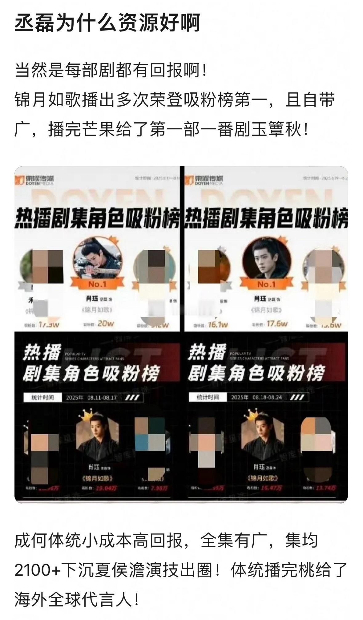 丞磊演技不错的,三部男主剧有两部集均过2000了,每部rs数只有几百,真的是低投入高回报了