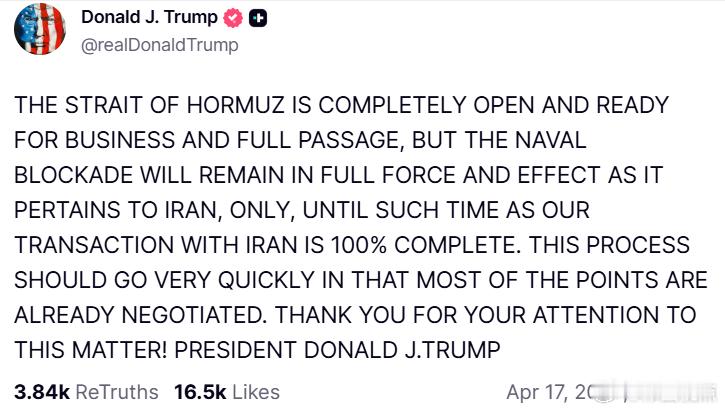 霍尔木兹海峡现已完全开放,随时准备开展商业活动并允许全面通行。但针对伊朗的海军封锁将保持全面有效,直至我们与伊朗的交易100%完成为止。此过程将进展得非常迅速,因为大部分要点已经谈判完成。感谢大家对此事的关注!
