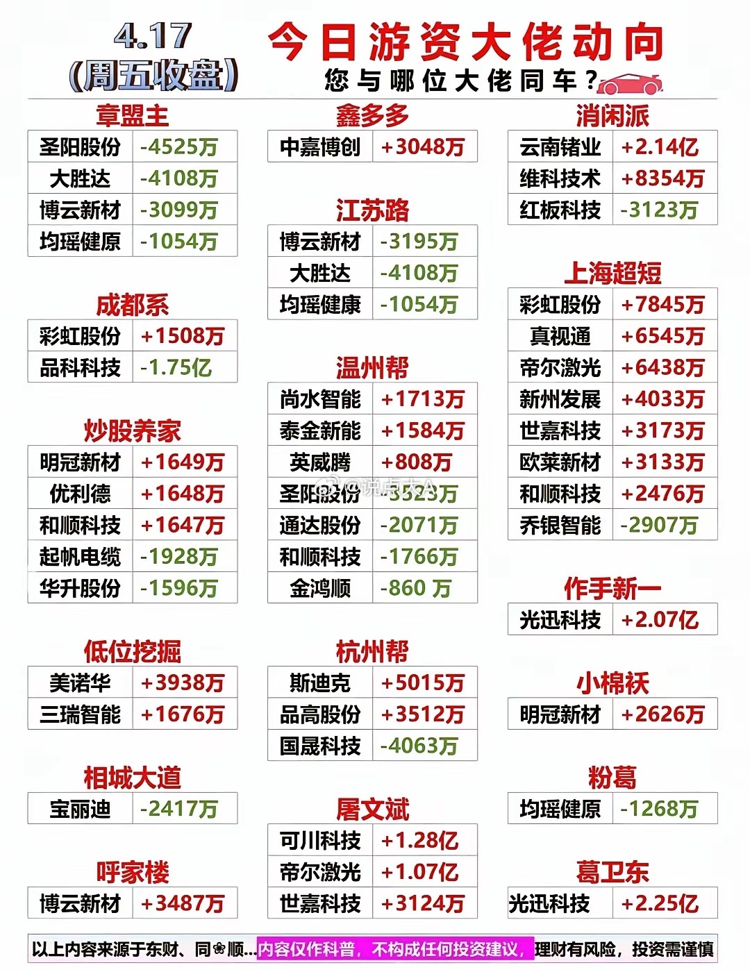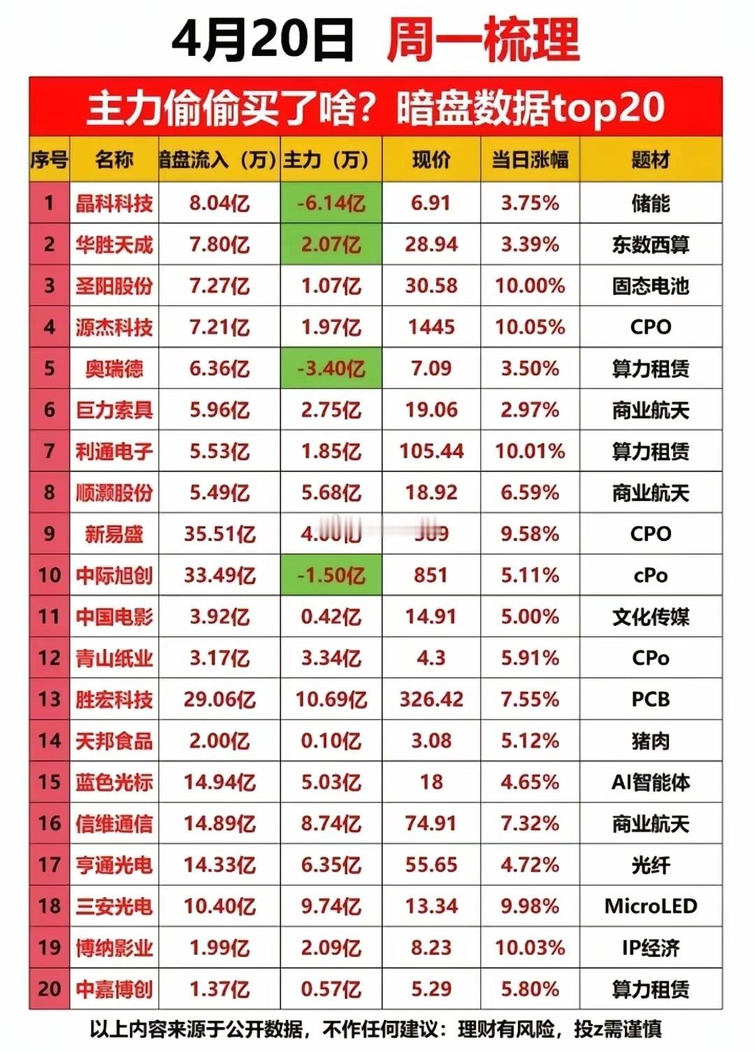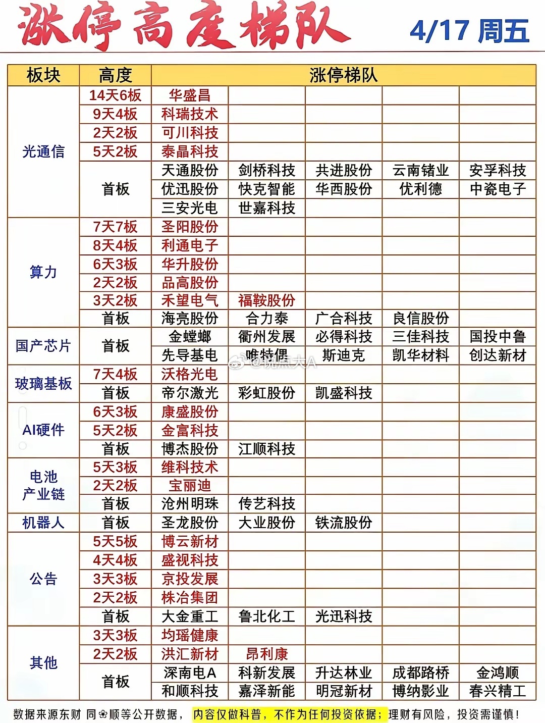 4月17日周五盘后|主线分歧还是机会?一文看透资金动向!大盘缩量分歧,北证50逆势领涨,三市成交24531亿放量980亿,资金面分化明显。指数红绿分化,个股跌多涨少,但市场情绪并未走弱,涨停76家、跌停仅7家,赚钱效应集中在高标与主线。高标接力:圣阳股份7板锁死空间板,算力、光模块梯队完整,多只个股走出连板趋势。资金流向:元件、通信设备获主力大幅加仓,电池、电网设备等赛道股遭资金兑现。游资动向:知名游资动向分化,光迅科技获多路大佬加持,部分高位股遭资金出货。暗盘数据已现端倪,CPO、算力租赁标的获提前布局,周一重点关注主线修复力度与高标承接。⚠️【风险提示】以上内容仅为市场数据整理与分享,不构成任何投资建议。股市有风险,投资需谨慎,请勿据此进行任何交易操作。