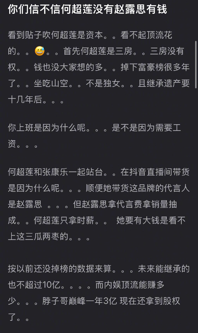瓣人认为何超莲还没有赵露思有钱,大家认同吗?