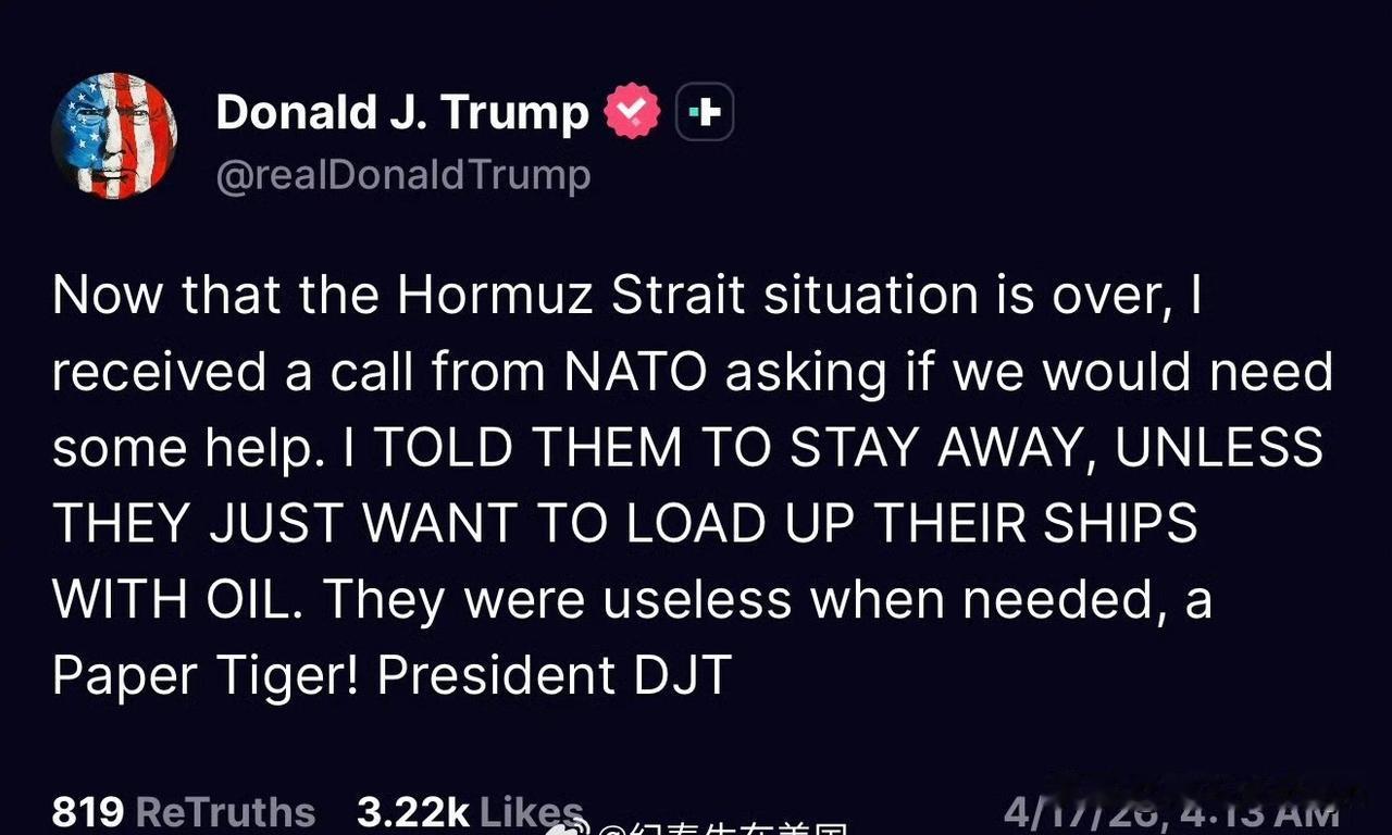 4月17日特朗普发帖写道:“随着霍尔木兹海峡局势已经结束,我接到了北约的电话,问我们是否需要一些帮助。我告诉他们离远点,除非他们只是想把船装满石油。他们在真正需要的时候毫无用处,不过是个纸老虎!”