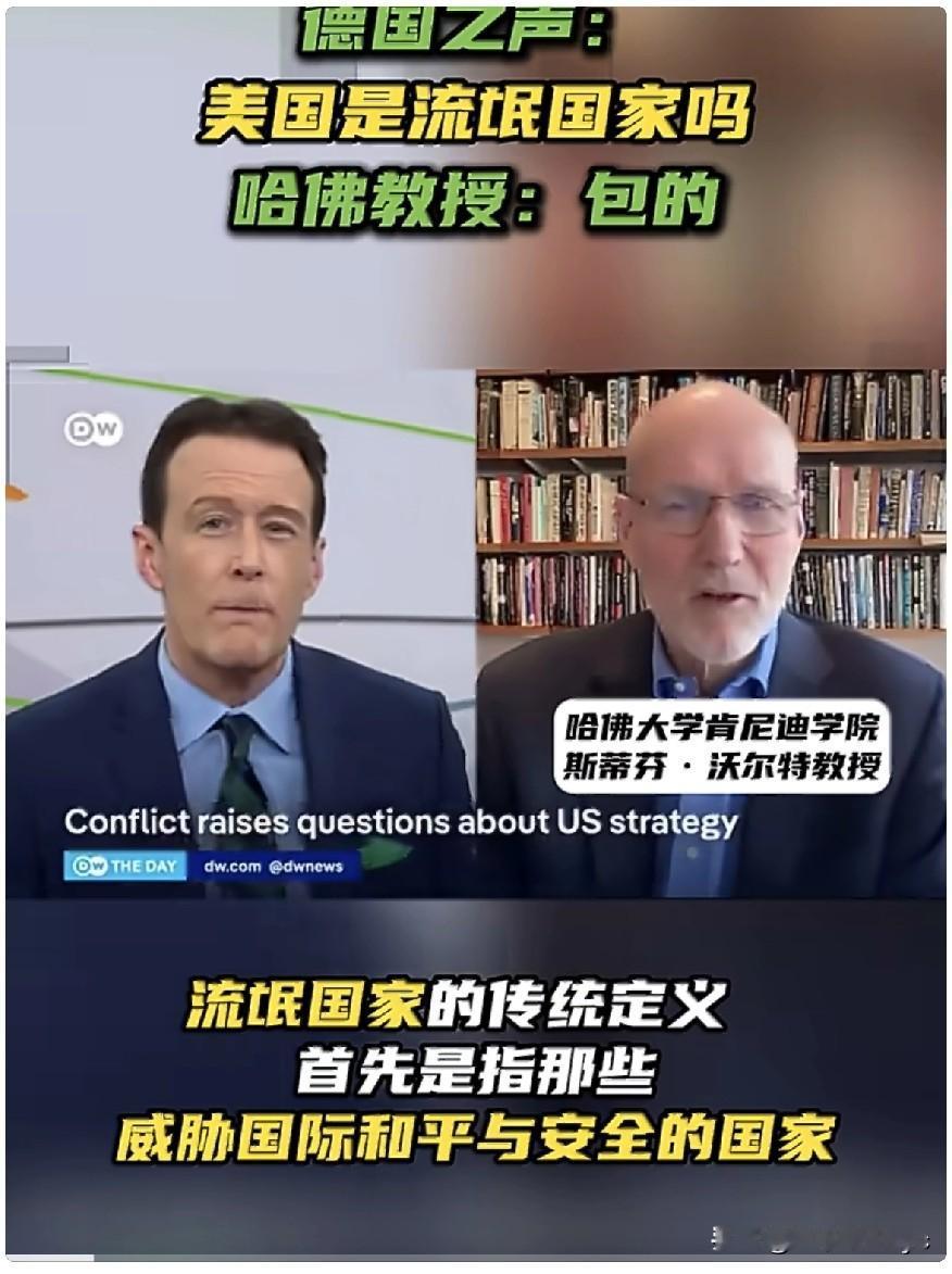 4月16日,美国哈佛大学国际事务教授斯蒂芬·沃尔特在接受德国媒体“美国是流氓国家吗”的专题访谈中表示:美国目前的行为已从多方面符合“流氓国家”的特征。