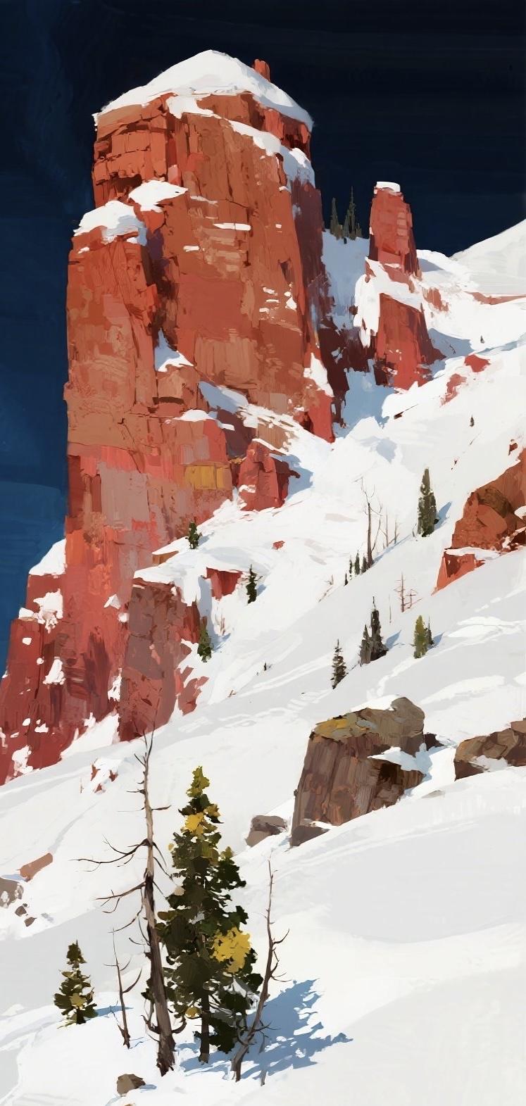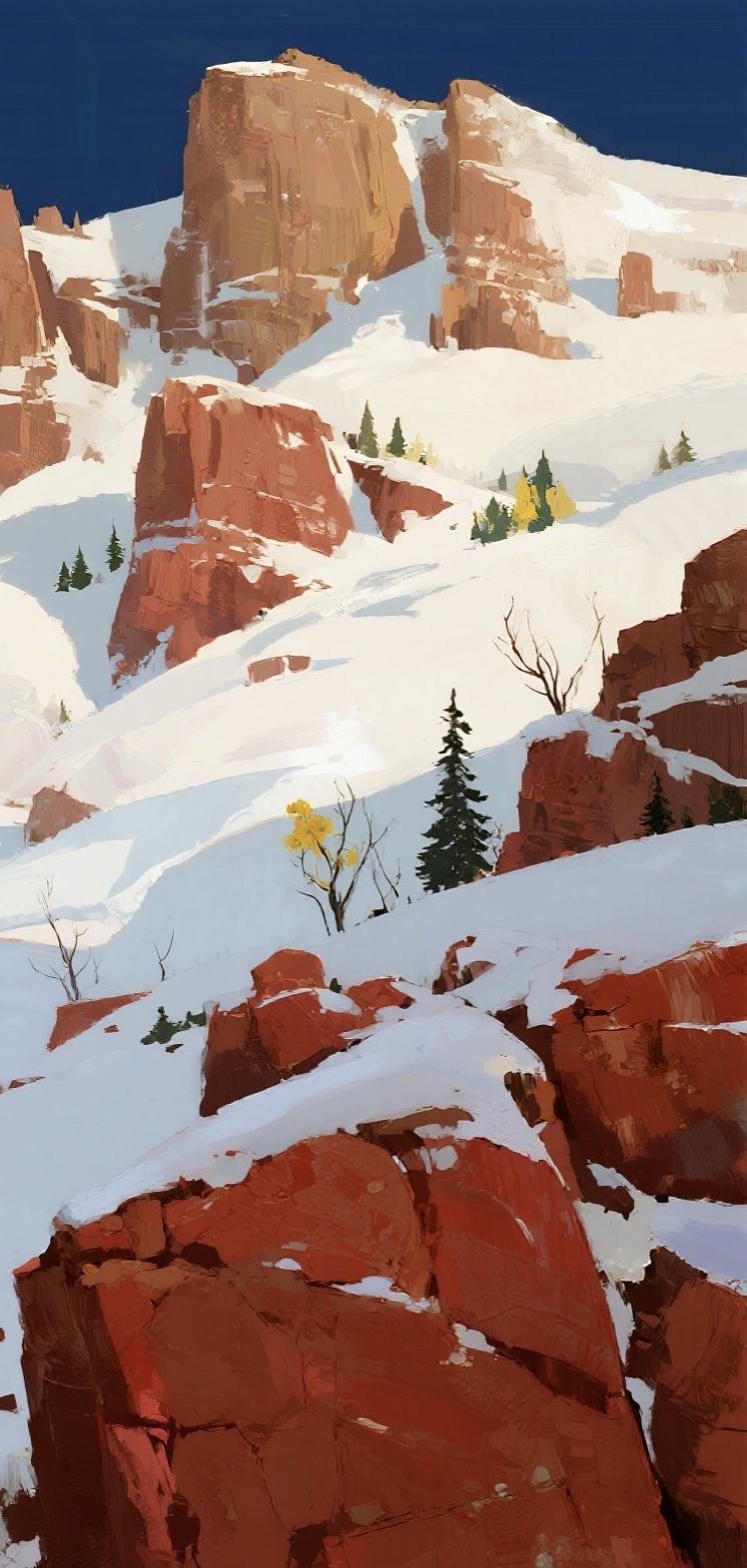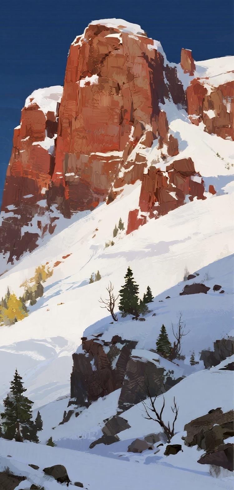 📝这幅新中式岩彩山水画面极简,主体是高耸的悬崖,崖顶覆着纯白积雪,下方是大片高饱和的褐色巨岩,白与红褐形成鲜明对比。