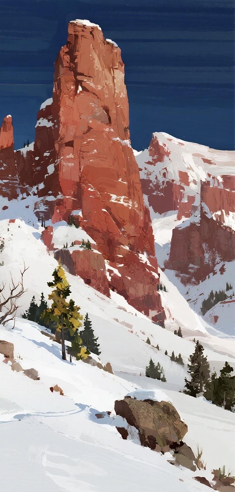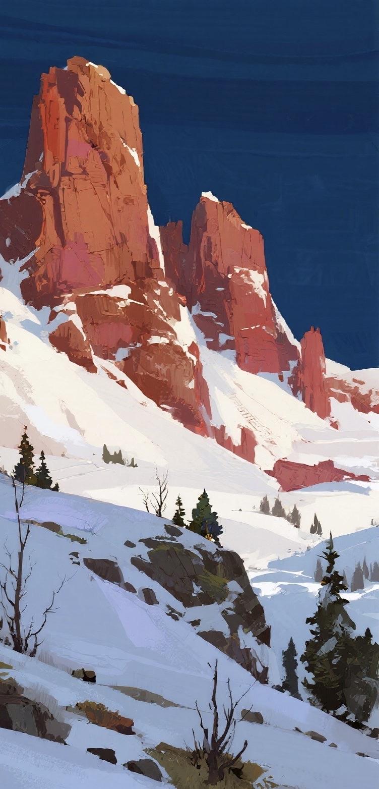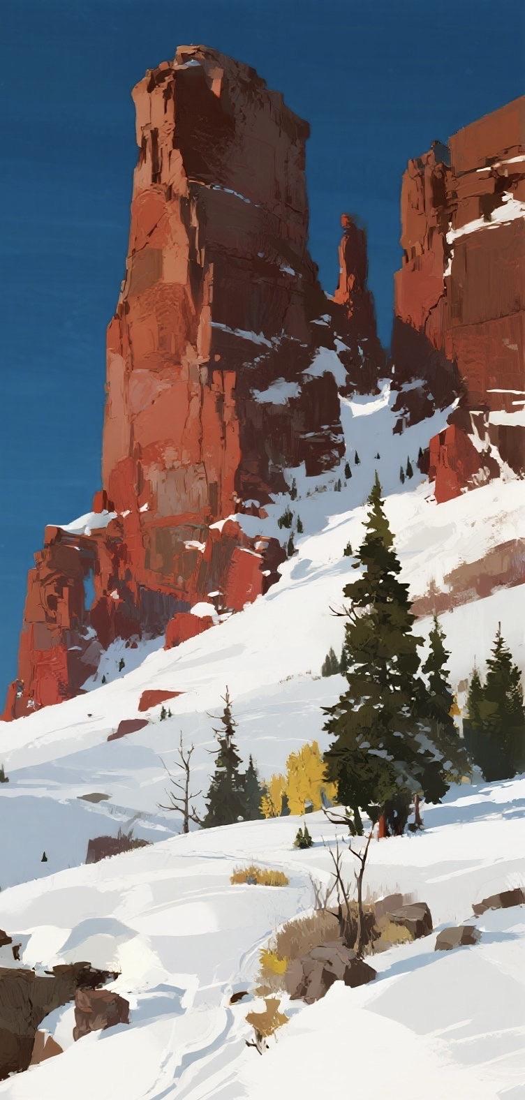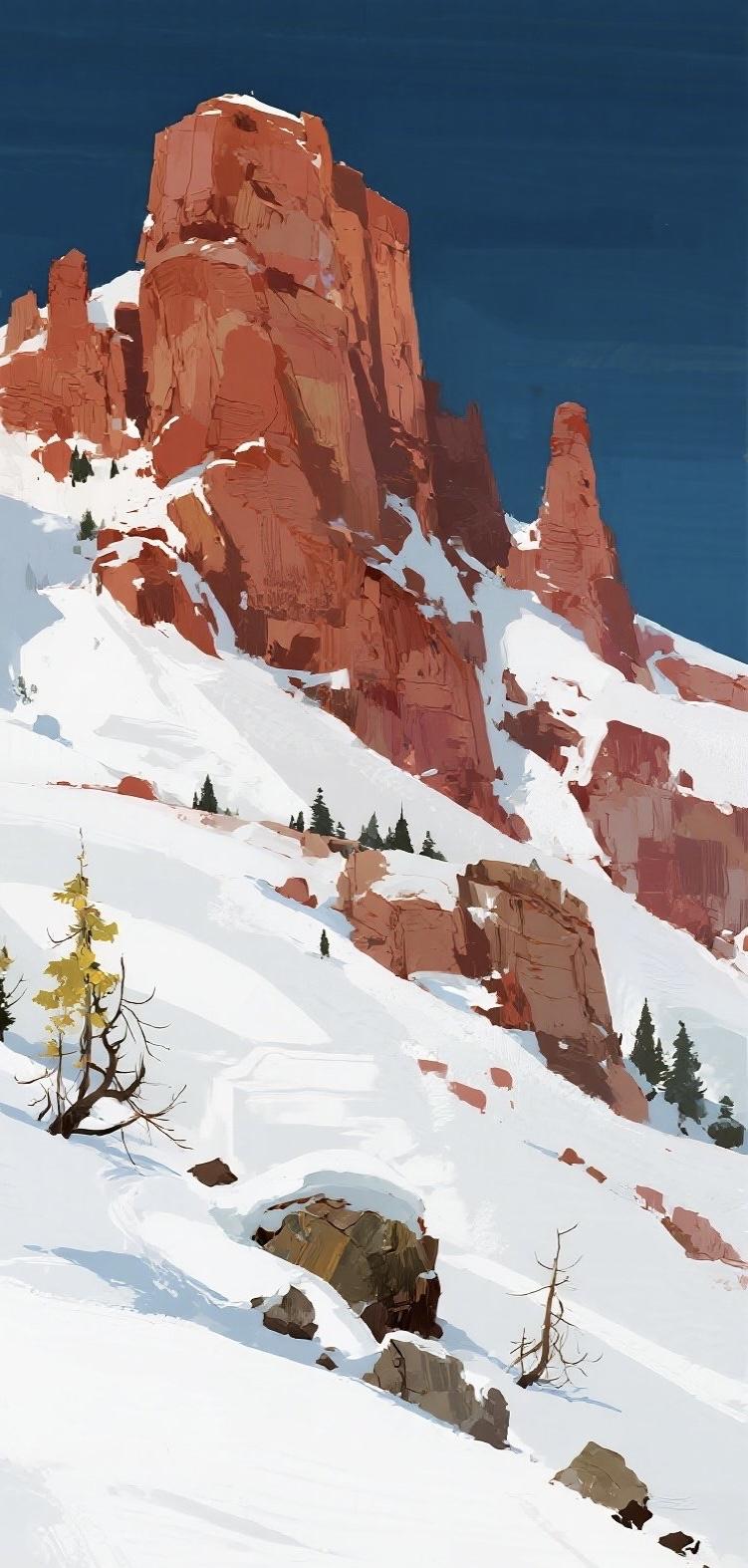 📝这幅新中式岩彩山水画面极简,主体是高耸的悬崖,崖顶覆着纯白积雪,下方是大片高饱和的褐色巨岩,白与红褐形成鲜明对比。