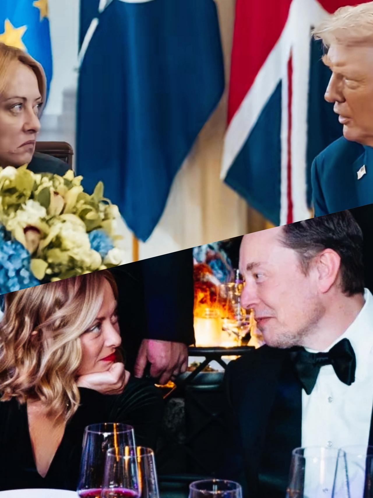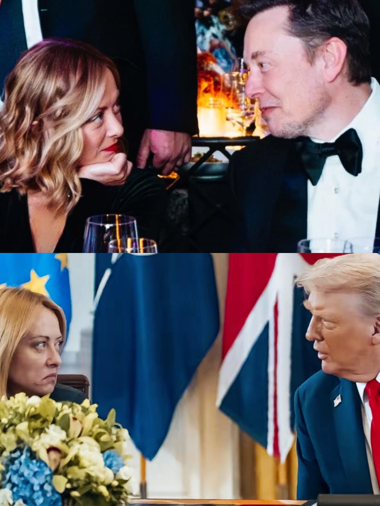 梅洛尼看向马斯克和特朗普时,表情和眼神各自代表什么意思呢? 梅洛尼望着马斯克,是