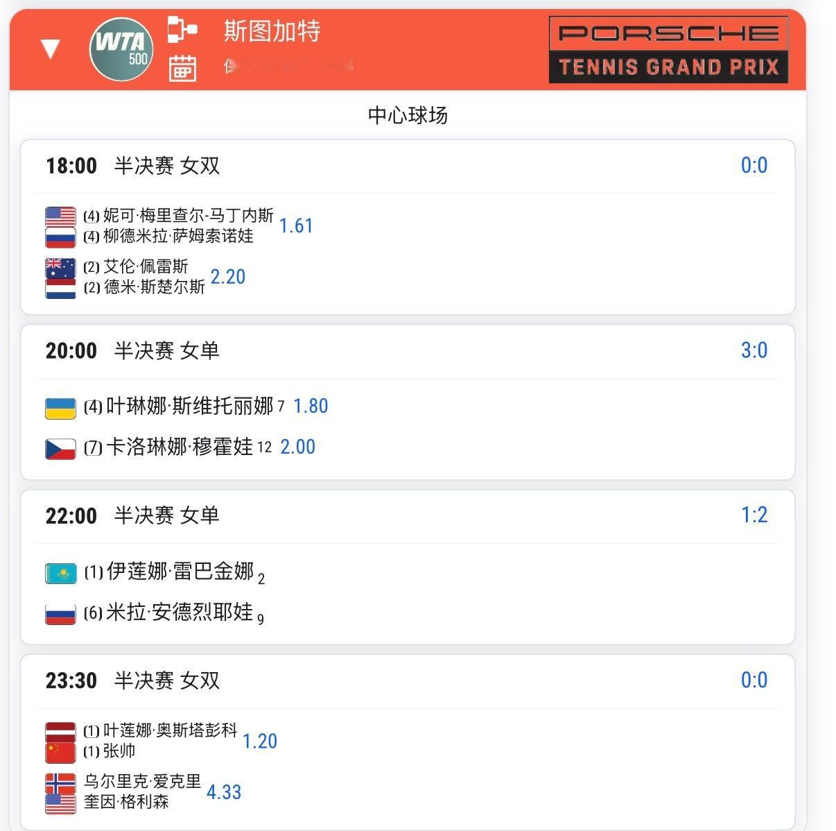 斯图加特四强出炉🔥【1】莱巴金娜vs安德列娃【6】【4】斯维托丽娜vs穆霍娃【