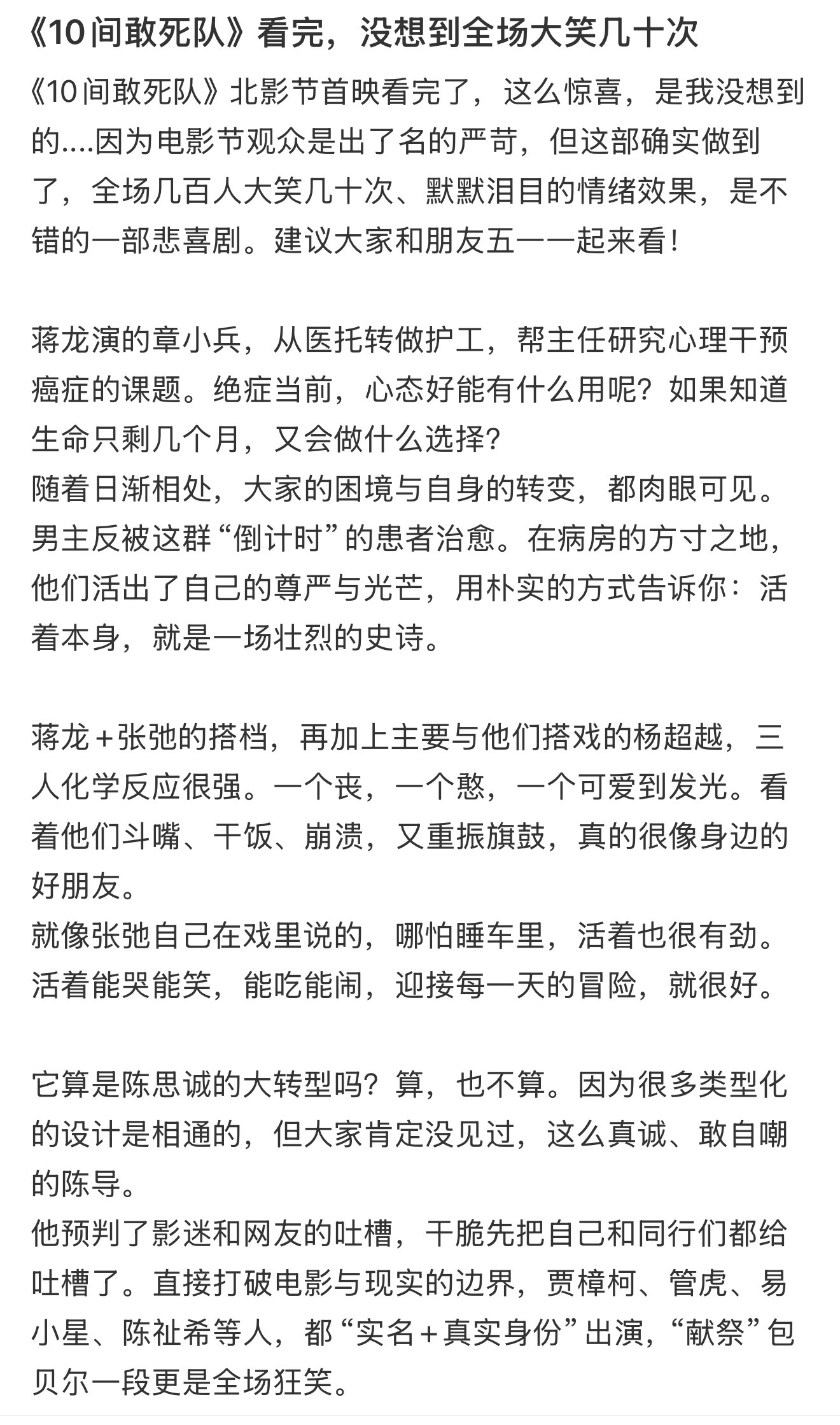 笑泪交织、节奏绝佳,绝症题材不煽情不卖惨,把一群普通人的遗憾与热爱拍得鲜活又治愈。悲喜切换恰到好处,前一秒破防落泪,下一秒爆笑破功,情绪被狠狠拿捏。
